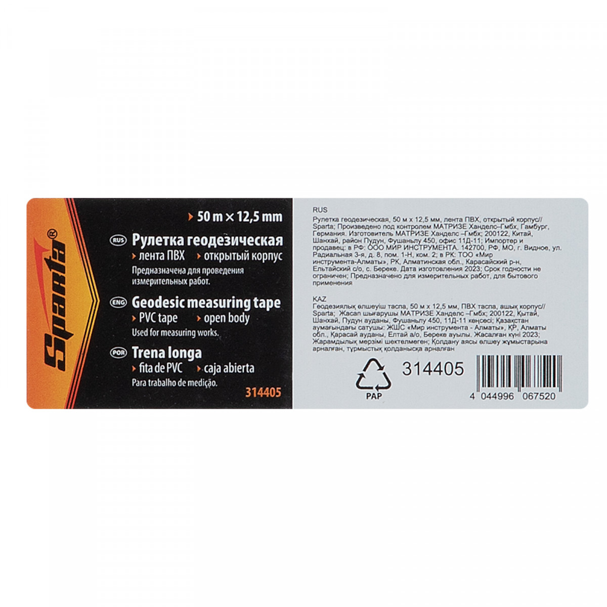 Рулетка геодезическая, 50 м х 12,5 мм, лента ПВХ, открытый корпус Sparta