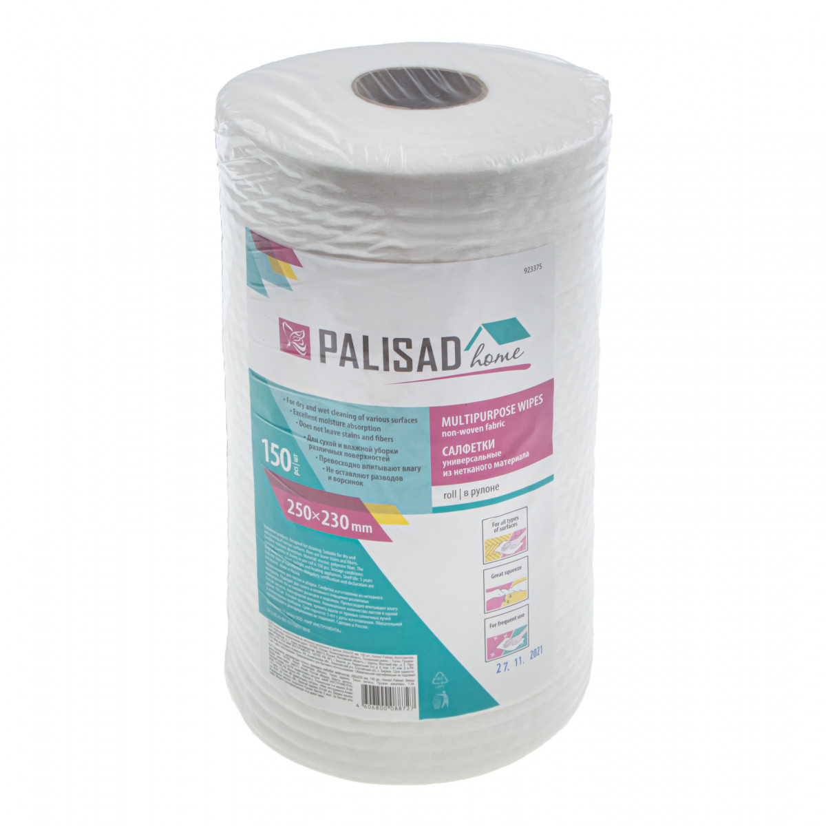 Салфетки универсальные из нетканого материала в рулоне Home Palisad 923375 размером 250 x 230 мм, 150 шт., отлично подходят для уборки дома, офиса или автомобиля. Благодаря своему составу (вискоза 50%, полиэстер 50%) хорошо собирают влагу и легко выжимаются. Салфетки удобно отделять от рулона по перфорированному краю.