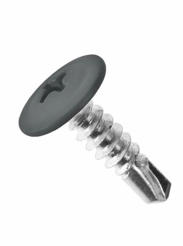 Для соединения элементов элементов кровли используют соответствующий крепёж. Особая форма сверла крепежа позволяет соединять части элементов кровли без предварительного засверливания и повреждения декоративно-защитного покрытия, а благодаря своеобразной форме головки обеспечивается плотное примыкание самонарезающего винта и материала элементов кровли. Саморез 4,2х16 RAL 7024 (серый графит) с прессшайбой со сверлом изготовлен из высокопрочной стали и не ржавеет. С его помощью составляющие элементов кровли будут надёжно соединены, а полимерное покрытие не подвергнется излишнему повреждению.