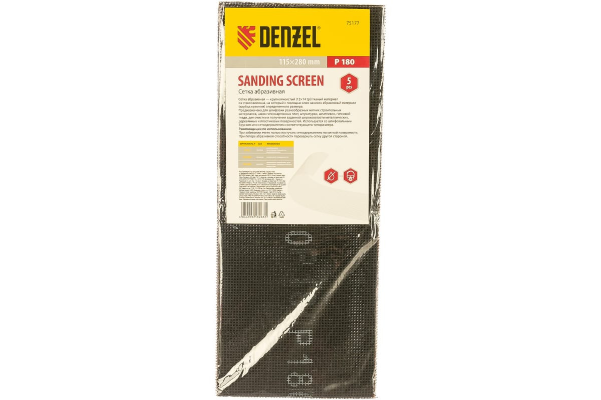 Абразивная сетка Denzel 75177, 115 х 280 мм, с зернистостью P 180, 5 шт. в упаковке, применяется для чистовой обработки и придания гладкости зашпаклеванным поверхностям, а также твердой древесине и металлу. Она бережно снимает тонкий слой материала и лакокрасочного покрытия, удаляет ржавчину и заусенцы, сглаживает неровности. Абразивный слой обладает высоким ресурсом, т.к. зерна карбида кремния стачиваются медленно. Сетку устанавливают на ручные шлифовальные приспособления — бруски и сеткодержатели соответствующего типоразмера.