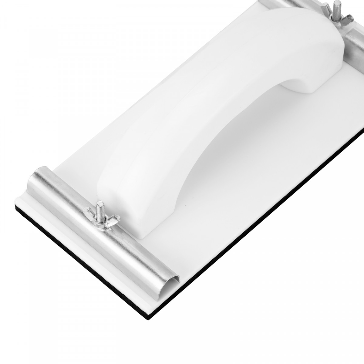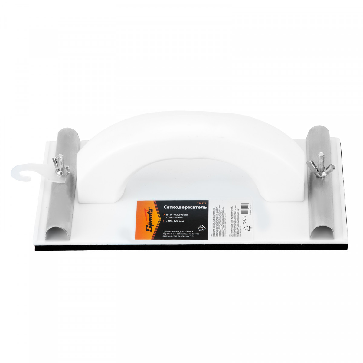Пластиковый сеткодержатель Sparta 758475 с подошвой 230 х 105 мм, с зажимами, используется для ручного шлифования деревянных, шпатлеванных, металлических, пластмассовых и прочих твердых поверхностей. Сеткодержатель фиксирует абразивную стеклосетку или шлифлист и позволяет удалять старые отделочные покрытия, подготавливать поверхность под покраску, а также выполнять чистовую обработку.