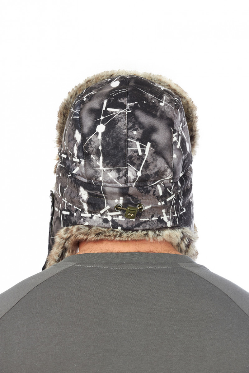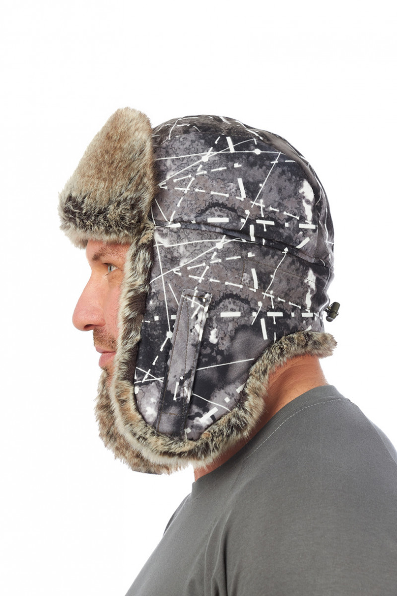 Материал верха - мембранная ткань "Алова", на подкладе флис и утеплитель "Термотекс". Застегивается на фастекс. На козырьке, внутренней части ушей и затылочной части утеплена искусственным мехом. Козырек отстегивается - зафиксирован на две кнопки. Объем шапки регулируется по обхвату головы. Уши шапки можно убрать назад и зафиксировать на две кнопки.
