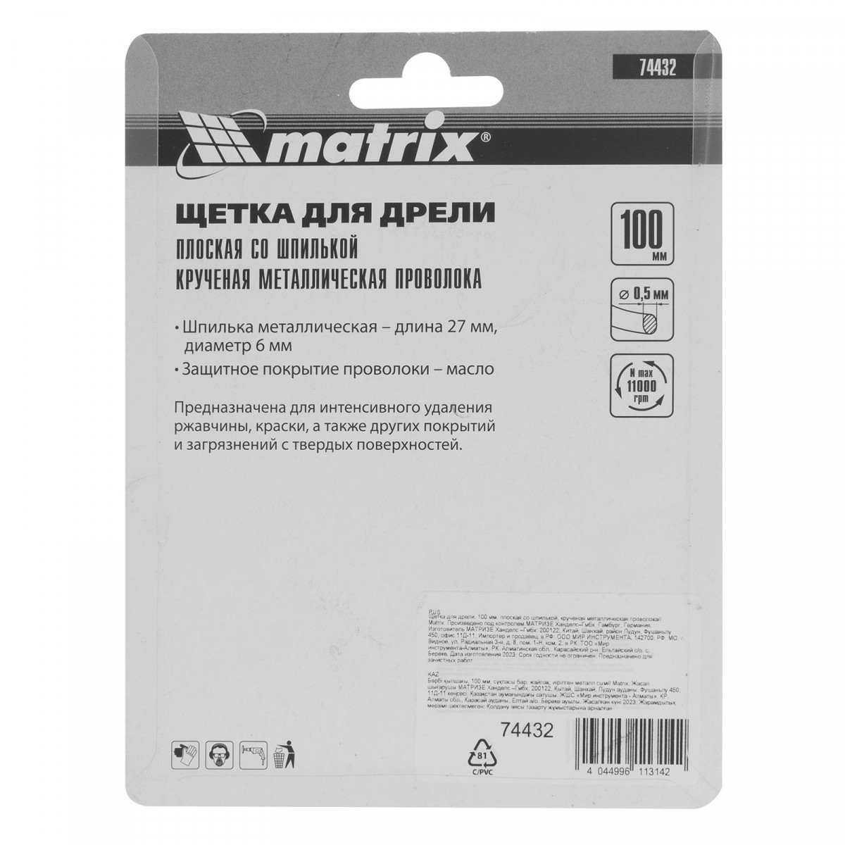 Щетка для дрели, 100 мм, плоская со шпилькой, крученая металлическая проволока Matrix