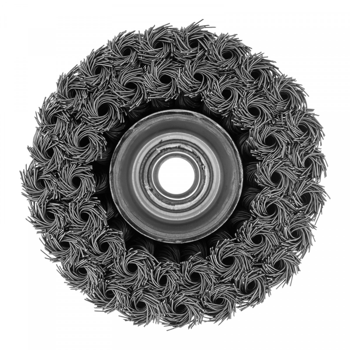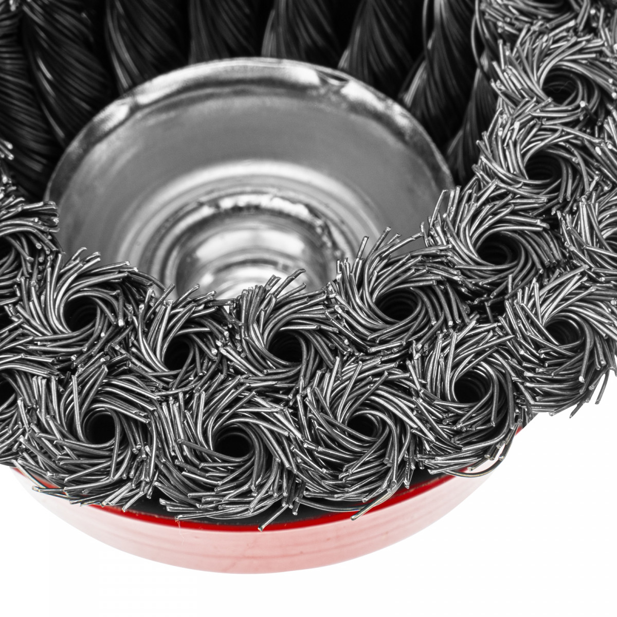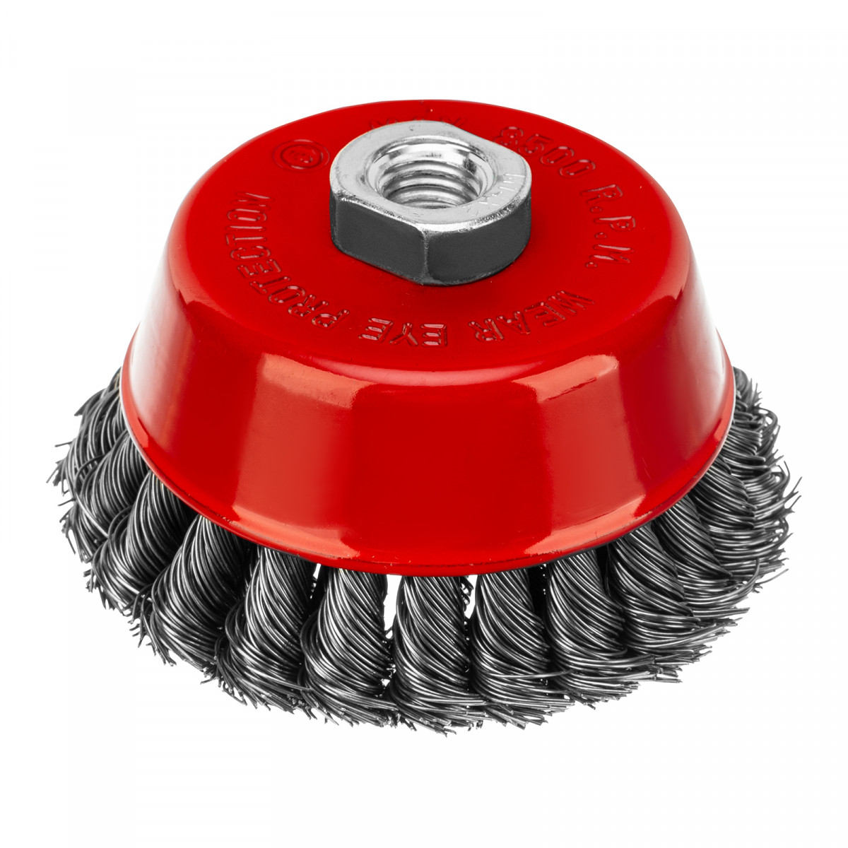 Двухрядная щетка Matrix «Чашка» 74682 диаметром 100 мм, с щетиной из крученой проволоки толщиной 0,5 мм, устанавливается на вал углошлифовальной машины с помощью гайки М14. Рекомендованная максимальная скорость вращения — до 8500 об/мин. Оснастка оптимальна для грубой (черновой) обработки: снятия старого слоя лакокрасочного покрытия и ржавчины, удаления загрязнений, зачистки сварных швов. Эффективно справляется с зачисткой больших поверхностей, подходит для выполнения работ повышенной сложности.