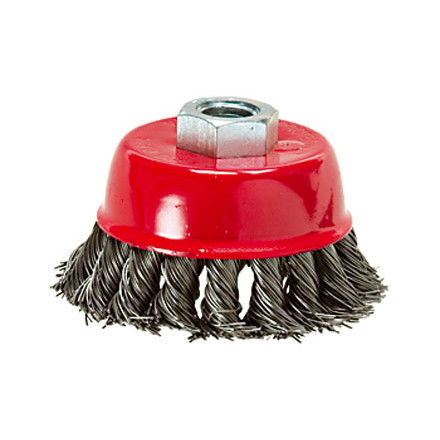 Щетка изготовлена из крученой стальной проволоки. Применяется для грубой очистки металлических поверхностей от ржавчины, грязи и зачистки сварных швов. Тип посадки – М14.