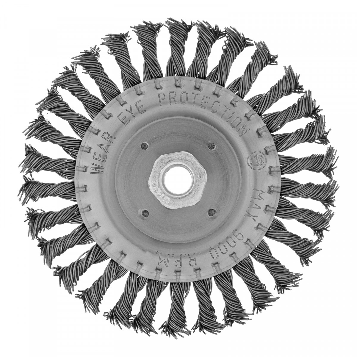 Плоская щетка Matrix 74645 диаметром 150 мм, с щетиной из крученой проволоки толщиной 0,8 мм и гайкой М14, — оснастка для УШМ, предназначенная для грубой (черновой) обработки поверхностей. Максимально допустимая скорость вращения шпинделя — 9000 об/мин. Щетка позволяет снять толстый слой ржавчины, лакокрасочных покрытий, загрязнений, а также зачистить сварные швы. Плоская форма удобна для обработки углов, изгибов и других труднодоступных мест.