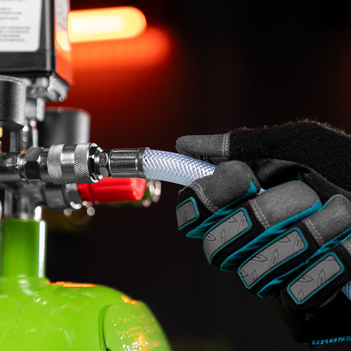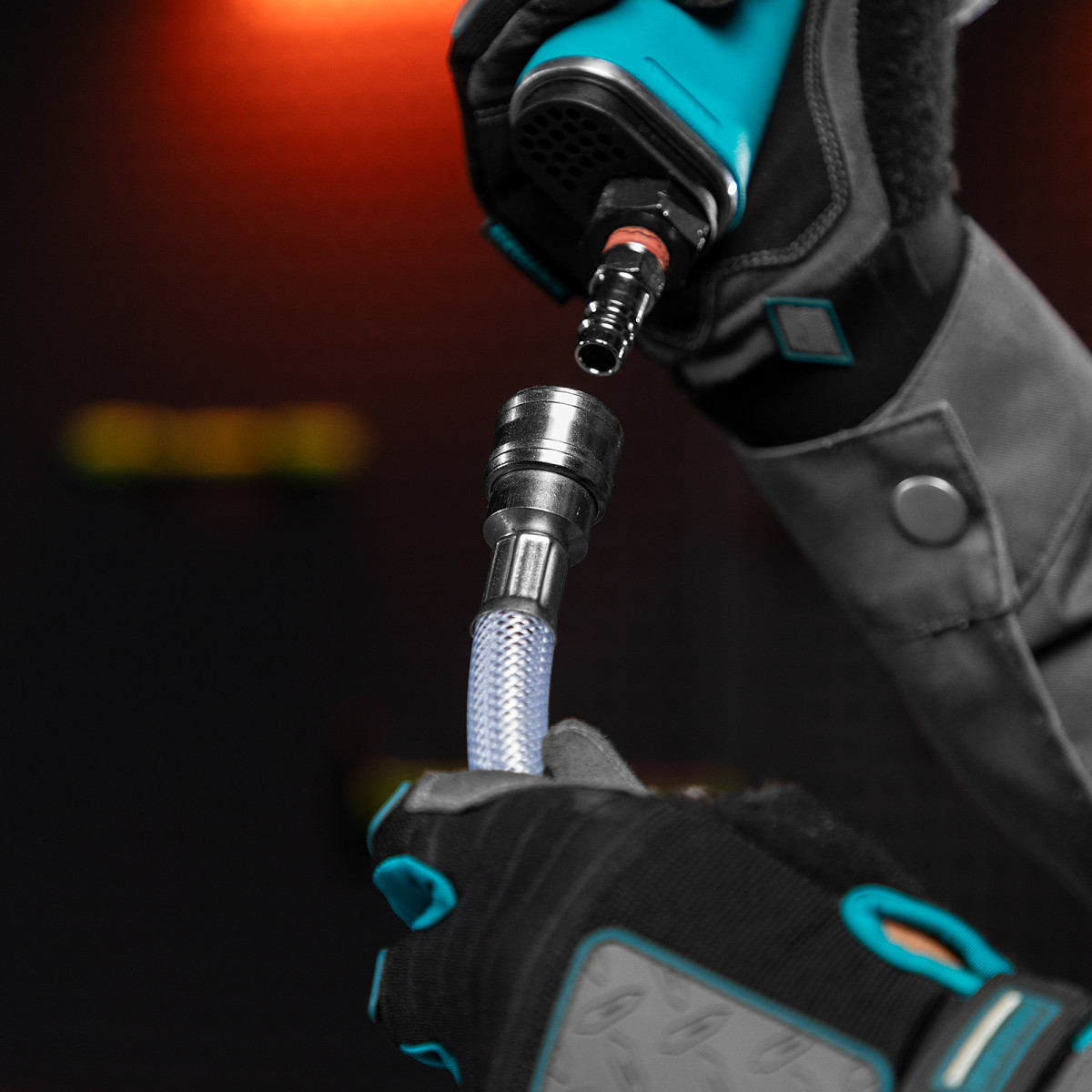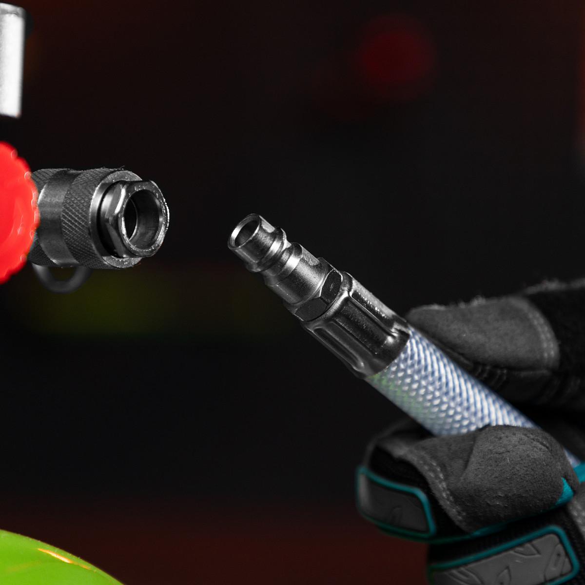 - Шланг можно быстро подключить к компрессору и пневматическим инструментам благодаря быстросъемным соединениям типа рапид.