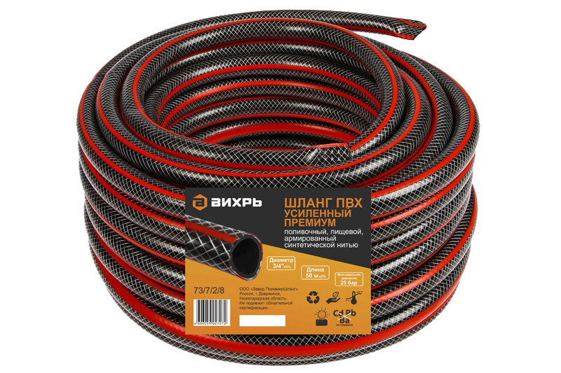 Шланг Вихрь 73/7/2/8 поливочный усиленный, премиум качества предназначен для полива земельных участков, газона и других подобных поверхностей. Шланг выполнен из высококачественного ПВХ-материала, армированного трёхслойной нейлоновой нитью. Данная модель шланга является лучшей в своём классе. Выдерживает давление до 25 бар.