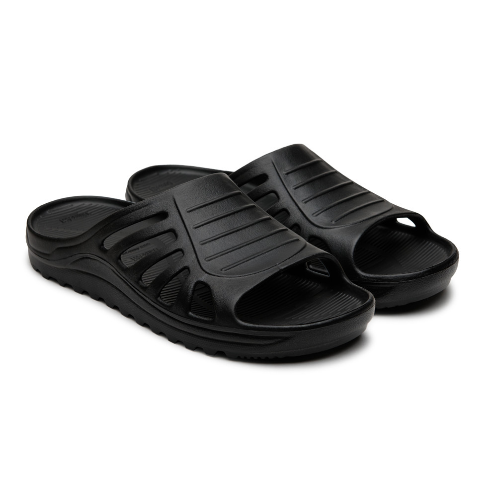 Пантолеты мужские из летней мягкой полимерной композиции EVA DU-Mild. Бесшовное монолитное литье из мягкого материала устойчивого к УФ, высоким температурам (до +40С) обеспечивают стойкость к деформации и удобство анатомической колодки. Дизайн представляет собой широкие вентиляционные отверстия и рельефный рисунок по стельке с массажным эффектом. Чаще всего такие тапочки носят в бассейне, на пляже, дома, на даче, но их можно легко интегрировать и в повседневные городские образы. Например, их, можно надеть вместе с джинсами.