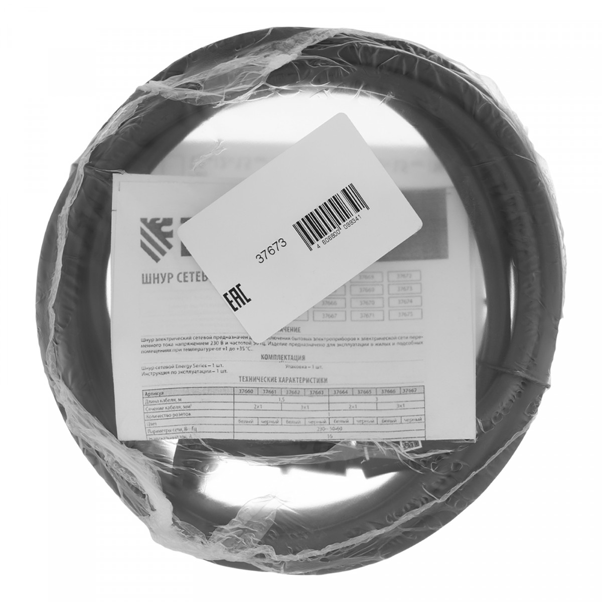 Шнур сетевой Energy Series, ПВС, 3 м, 2 x 1,5 мм, с неразборной вилкой, черный, Denzel