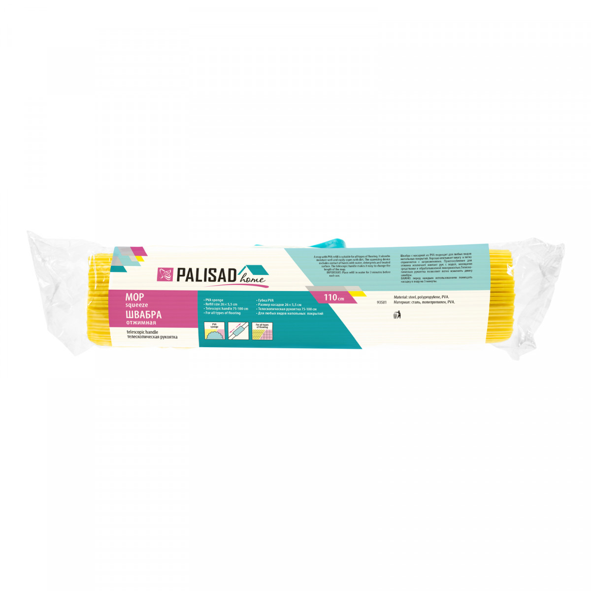 Бирюзовая отжимная швабра Palisad Home 93581 длиной 110 см, с телескопической рукояткой и полимерной губкой размером 26 x 5,5 x 6 см, используется для проведения влажной уборки. Губка из поливинилацетата хорошо впитывает влагу и эффективно удаляет загрязнения с напольных покрытий всех видов. Отжимной механизм позволяет исключить контакт рук с грязной водой, моющими средствами и обрабатываемой поверхностью.