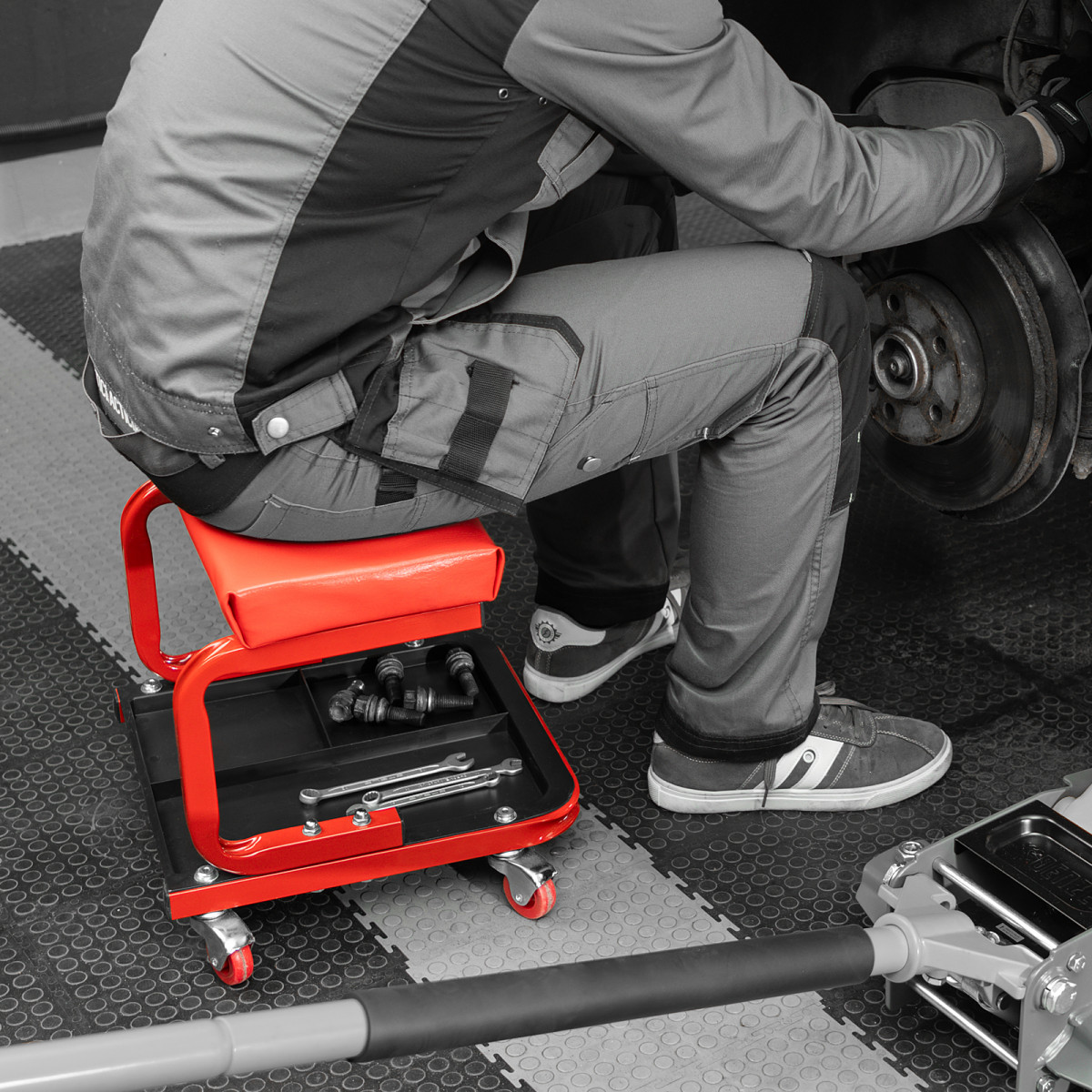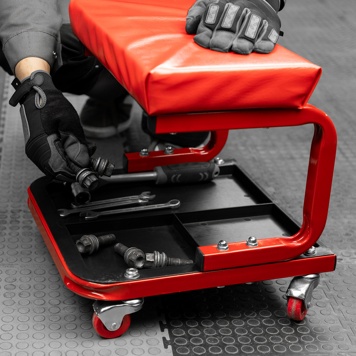 • На сиденье предусмотрены 4 колеса с углом поворота на 360°, поэтому можно с удобством перемещаться по гаражу.