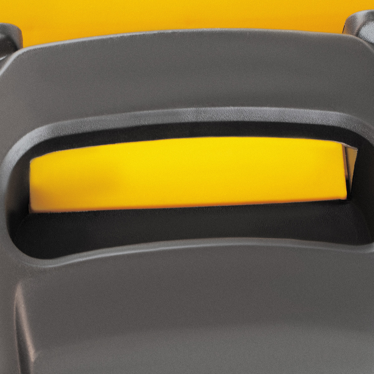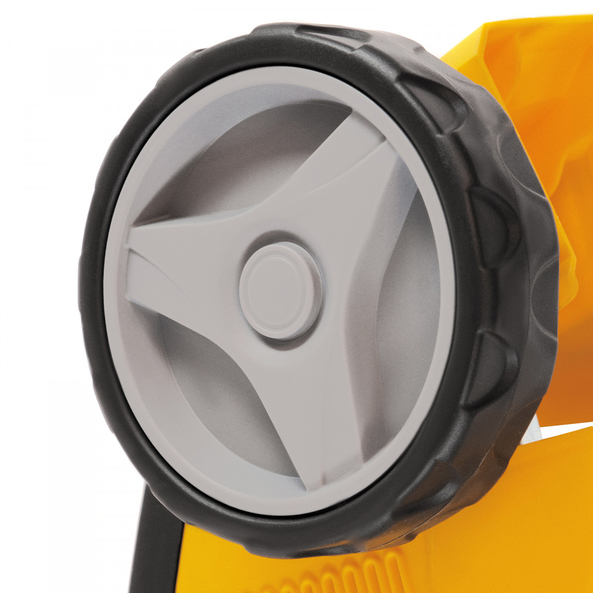 - Объемный травосборник на 40 л просто опустошается, не повреждается благодаря сочетанию твердого каркаса и мягкой ткани, а также легко очищается.