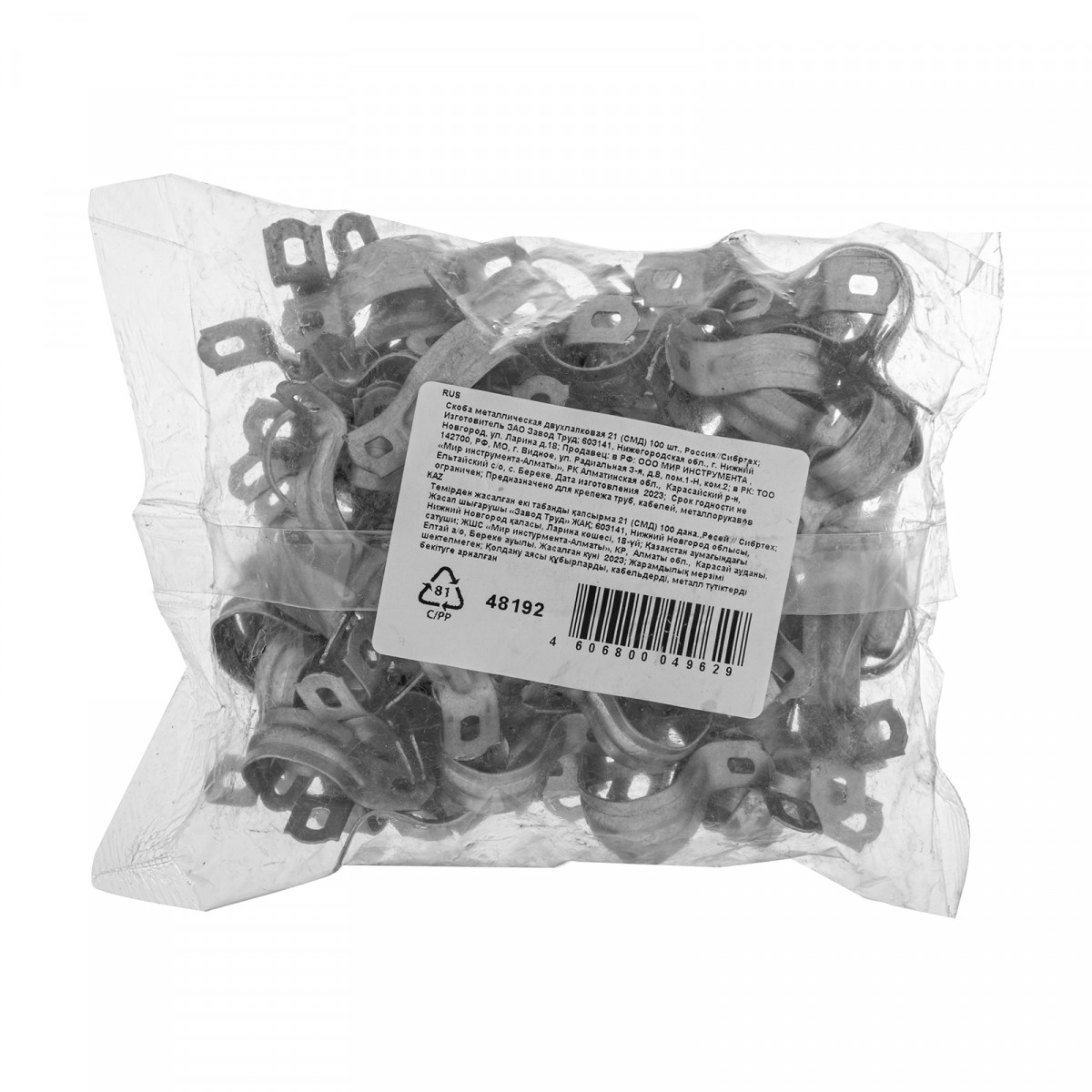 Двухлапковая металлическая скоба (СМД) Сибртех 48192 диаметром 21 мм, 100 шт. в комплекте, используется для крепления труб, проводов и шлангов на различных строительных конструкциях, имеющих 2 параллельных ряда крепежных отверстий. Обеспечивает надежную фиксацию даже под воздействием сильных вибраций и сдвигающих нагрузок.