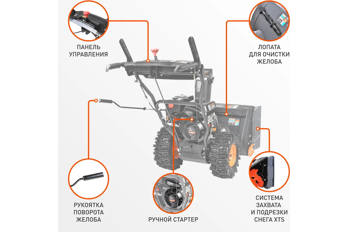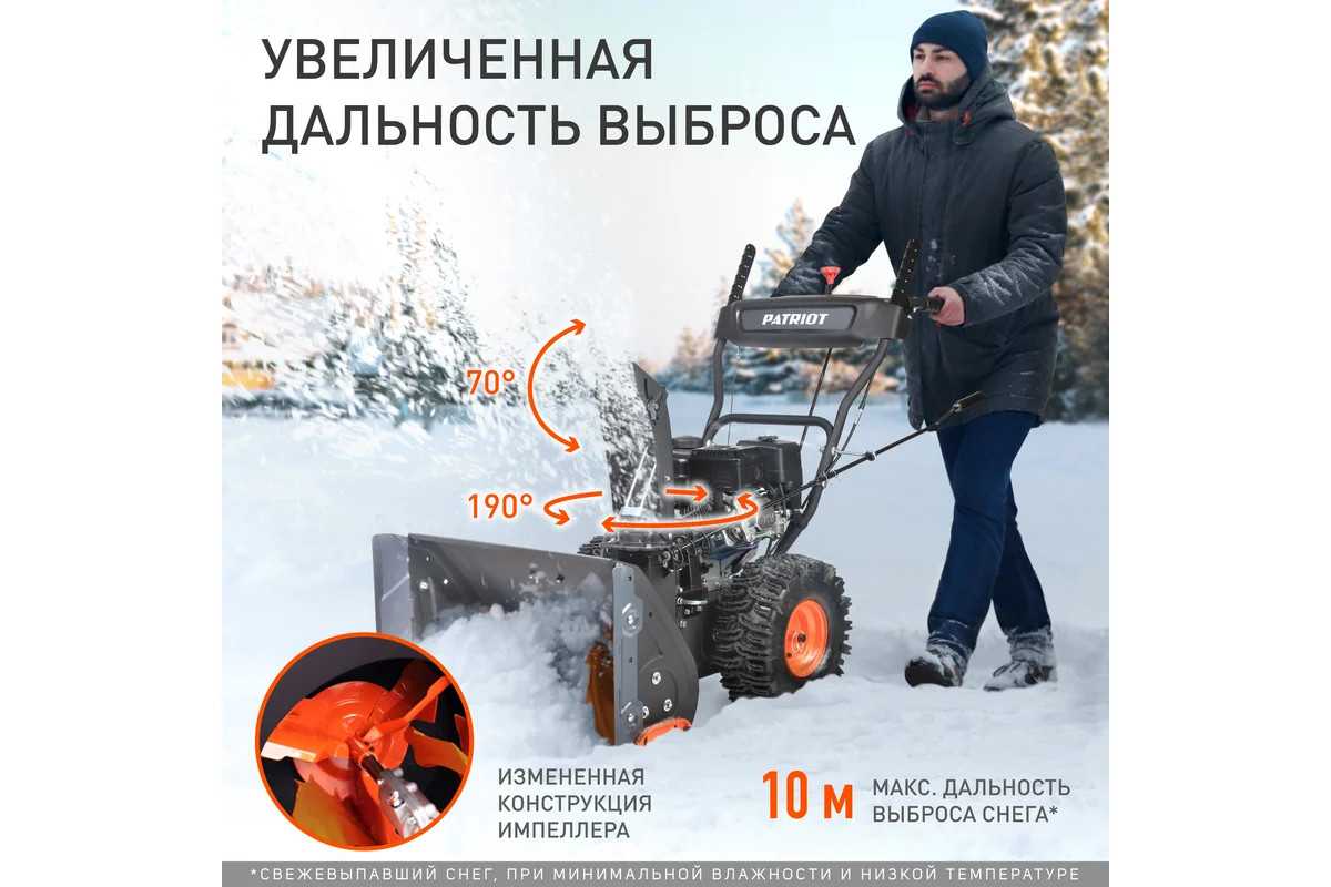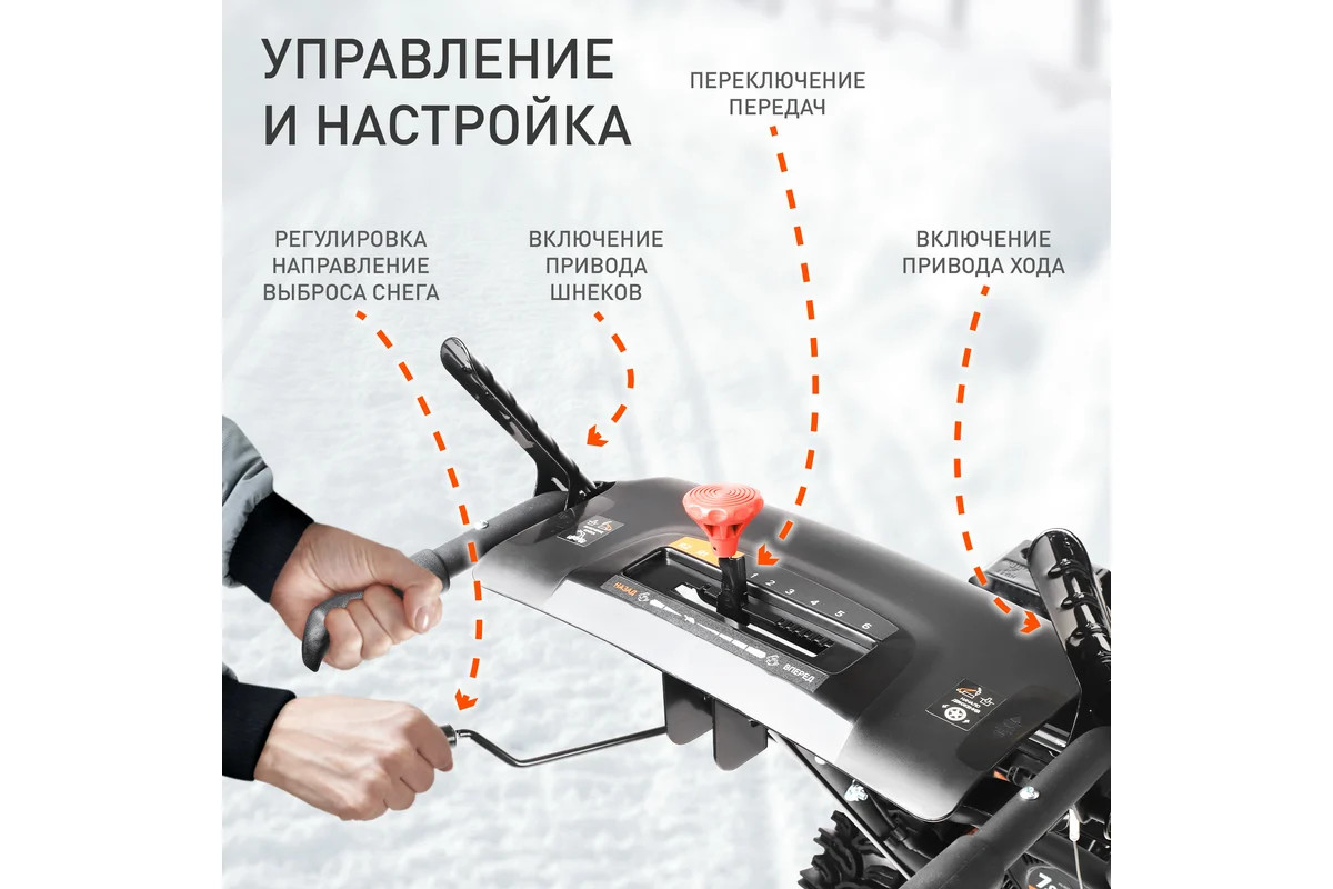 • Регулировка дальности выброса, угол выброса снега 70°;