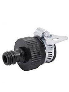 Соединитель с затяжным хомутом позволяет присоединить шланг к крану без резьбы, либо к вибрационному насосу. С другой стороны выход на переходник (быстросъемное соединение) для шланга диаметром 1/2, 5/8, 3/4.