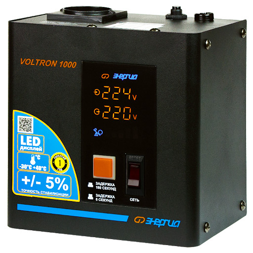 Маломощный отечественный стабилизатор релейного типа. Предназначен для защиты электроприборов с небольшим потреблением энергии, таких как, телевизор, газовый котел, компьютер и другой техники. Отличается высокой точностью стабилизации (погрешность не превышает плюс-минус 5%), способностью бесперебойной работы при частых скачках и больших просадках напряжения до 105 вольт. Универсальный монтаж и компактные габариты позволяют разместить Энергия Voltron 1000 HP практически в любом месте. Стабилизатор прост в подключении, оснащен вилкой-розеткой. Цифровой дисплей отображает все необходимы показатели: входное/выходное напряжения, задержку, сеть, защиту. Гарантийный срок составляет один год.