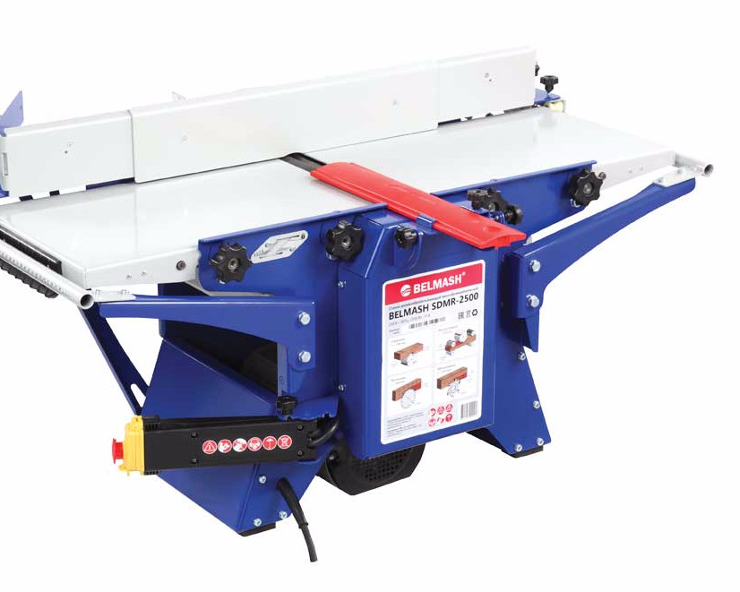 Деревообрабатывающий станок многофункциональный Белмаш SDMR-2500 используется для универсальной обработки деревянных заготовок. Основные функции изделия: распиловка, строгание, рейсмусование, фрезерование. Небольшие размеры позволяют использовать оборудование в домашних мастерских и на производствах без подключения к силовым линиям 380 В. Комплектация включает в себя необходимое оборудование для проведения работ всех видов. Настольная конструкция обладает необходимым весом и жесткостью, чтобы справляться с вибрацией при работе. Распиловку можно вести под углом до 45 градусов. Для пиления предусмотрен рабочий стол размерами 827х528 мм. Габариты стола для строгания составляют 912х284 мм. При рейсмусовании обеспечивается автоматическая подача заготовки со скорости до 6 метров в минуту. Для фрезерования используются фрезы диаметром 125 мм. Габариты, мм1030 х 680 х 570