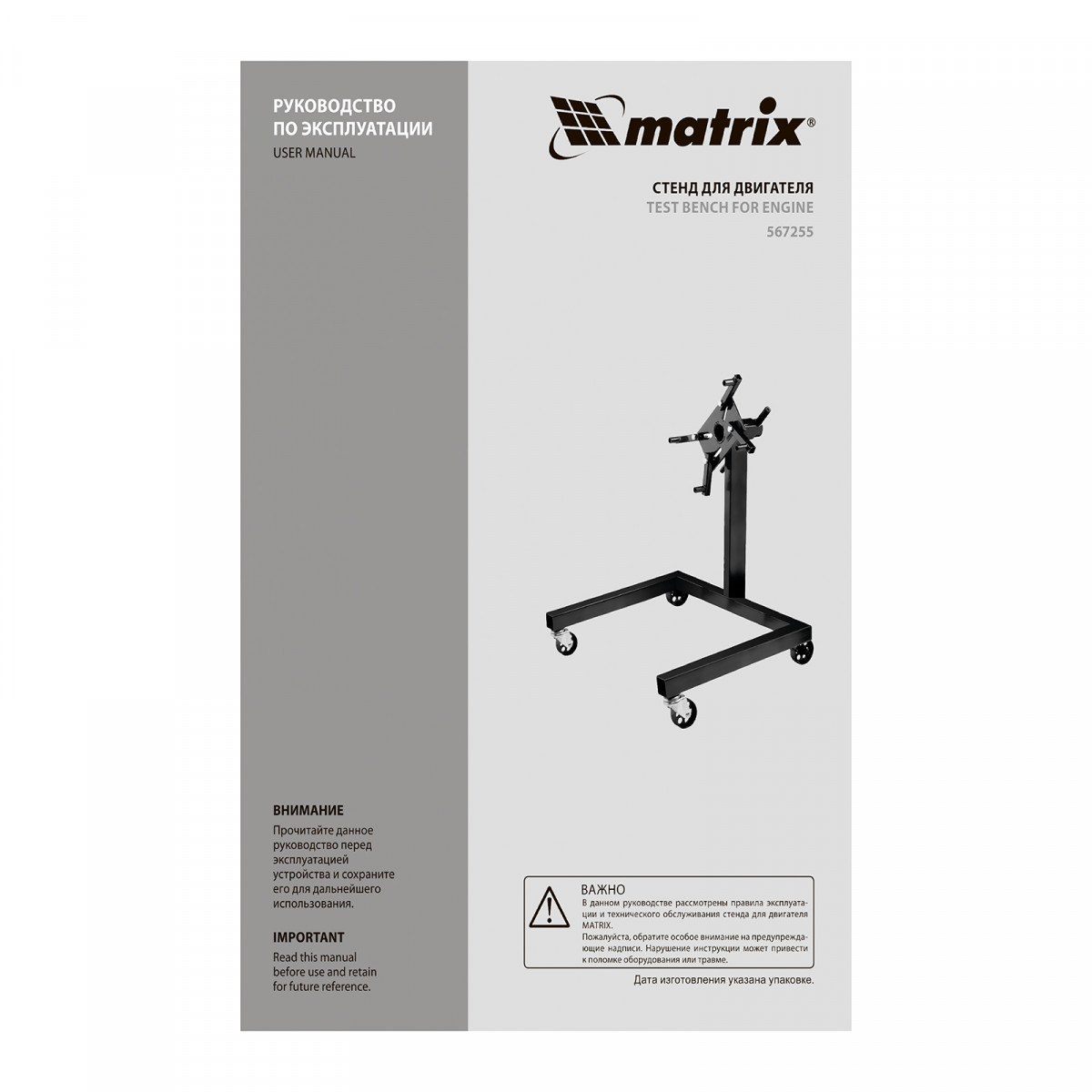 Стенд Matrix 567255 грузоподъемностью 500 кг (1250 Lbs) используется в автомастерских для осуществления ремонта и диагностики двигателя и его транспортировки внутри помещения. Благодаря конструкции с кронштейнами и регулируемыми захватами стенд-кантователь можно использовать для вывешивания практически любых двигателей массой до 500 кг. Для повышения безопасности работы рекомендуется использовать стенд со стойкой и краном.