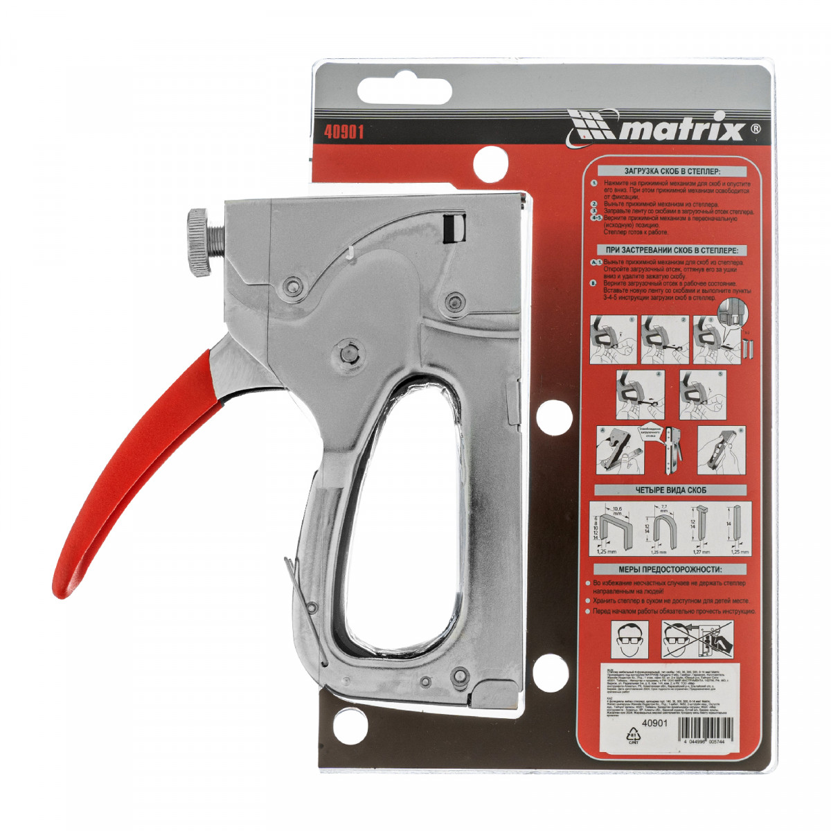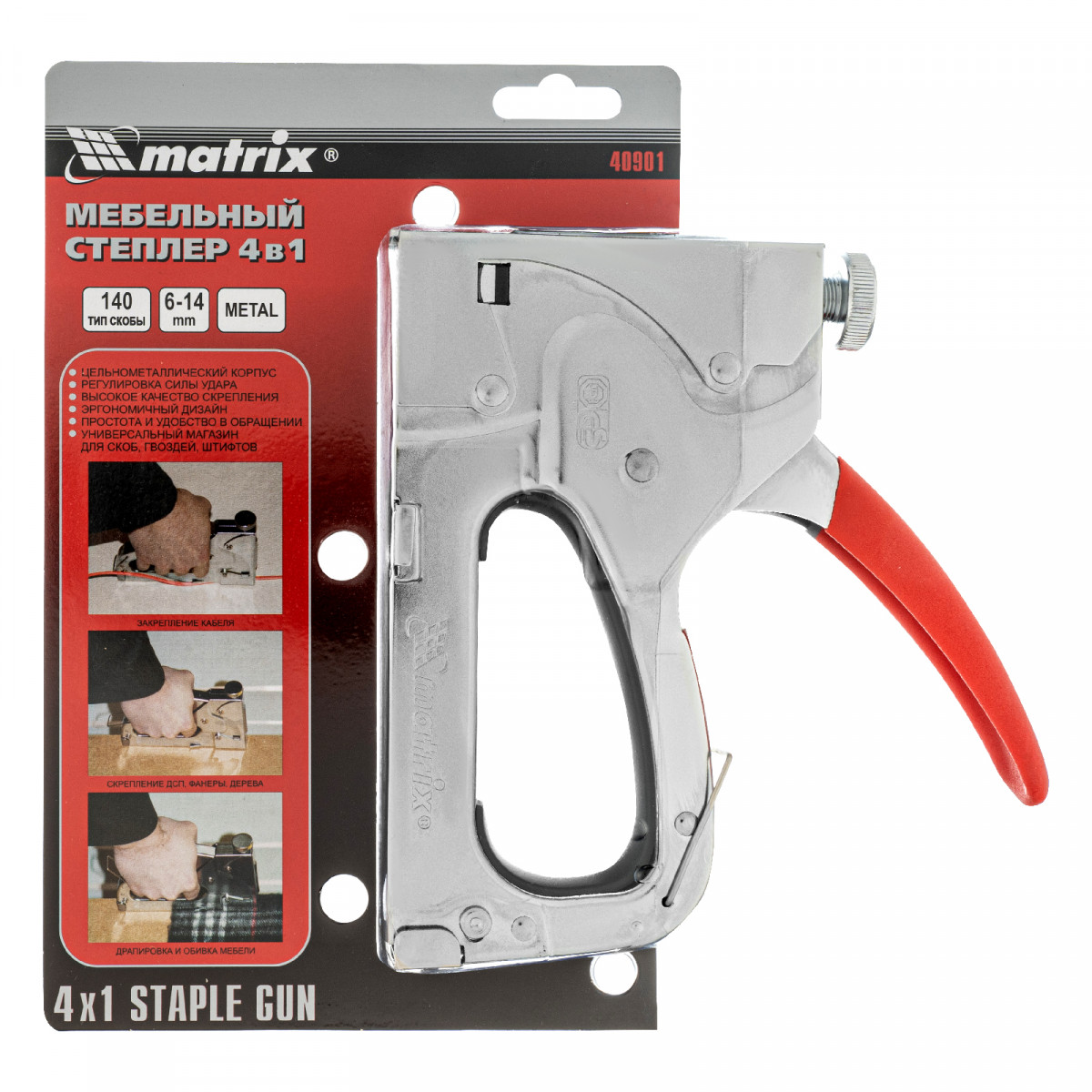 Мебельный 4-функциональный степлер Matrix 40901 имеет универсальный механизм, совместимый со скобами типов 140, 36, 300 и 500 размером 6-14 мм, поэтому его можно использовать не только для сборки и обивки мебели, но и для укладки ковровых покрытий, монтажа низковольтных кабелей, а также выполнения багетных работ. Инструмент применяется для закрепления фанеры, картона, ДВП, ДСП, пленки и утеплителя на деревянном основании. Штампованный стальной корпус устойчив к нагрузкам, поэтому степлер выдерживает интенсивное использование.