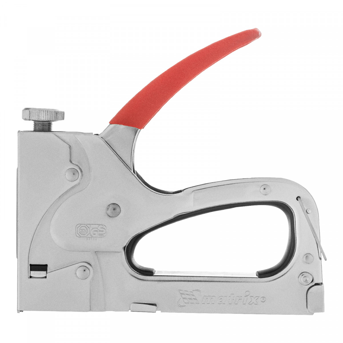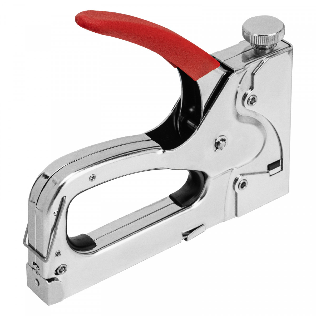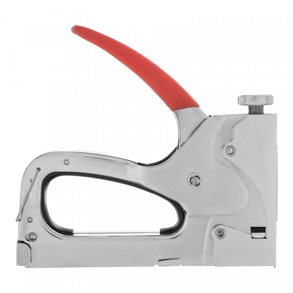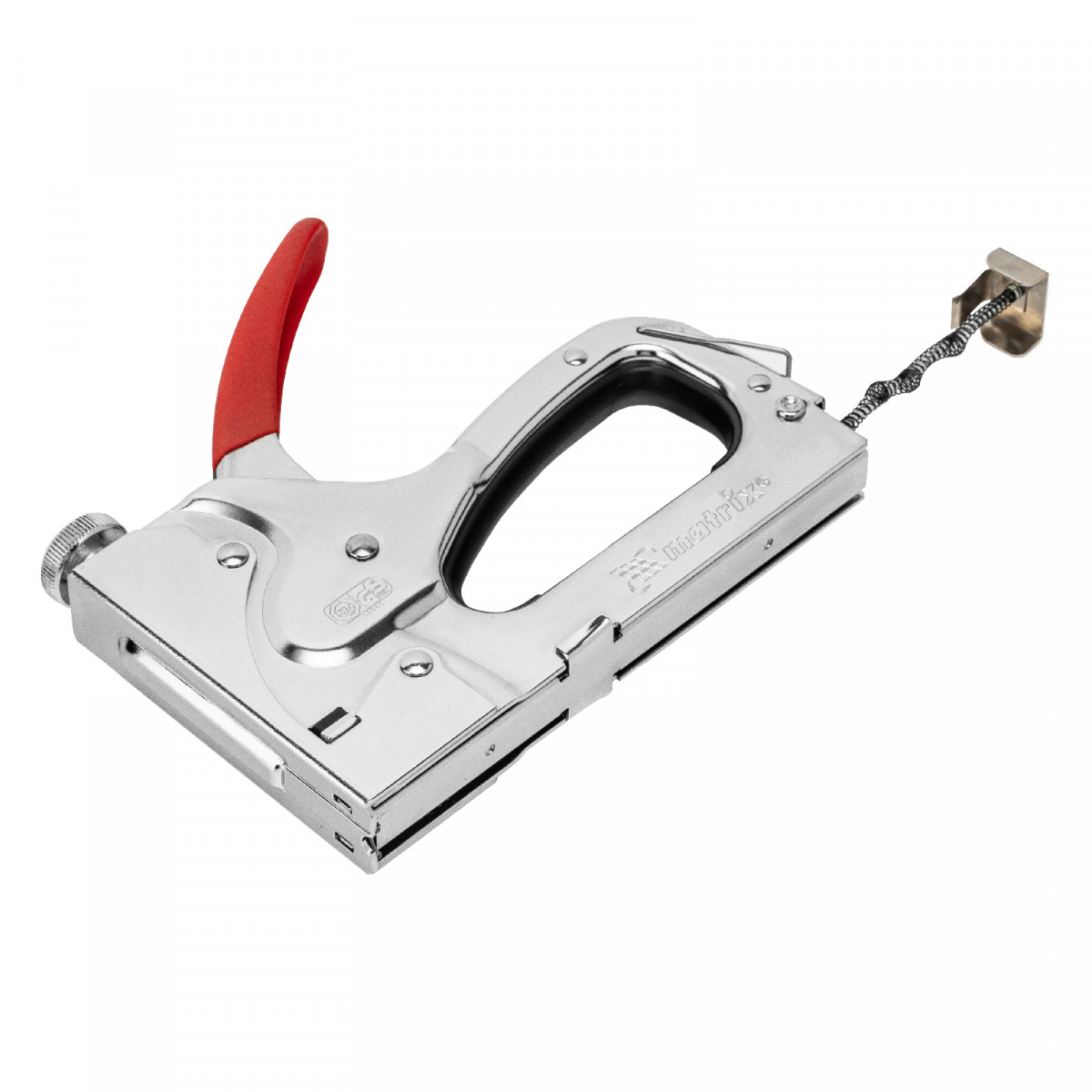 - Безопасное хранение и транспортировка — накидная скоба фиксирует рукоятку, предотвращая случайное срабатывание степлера.