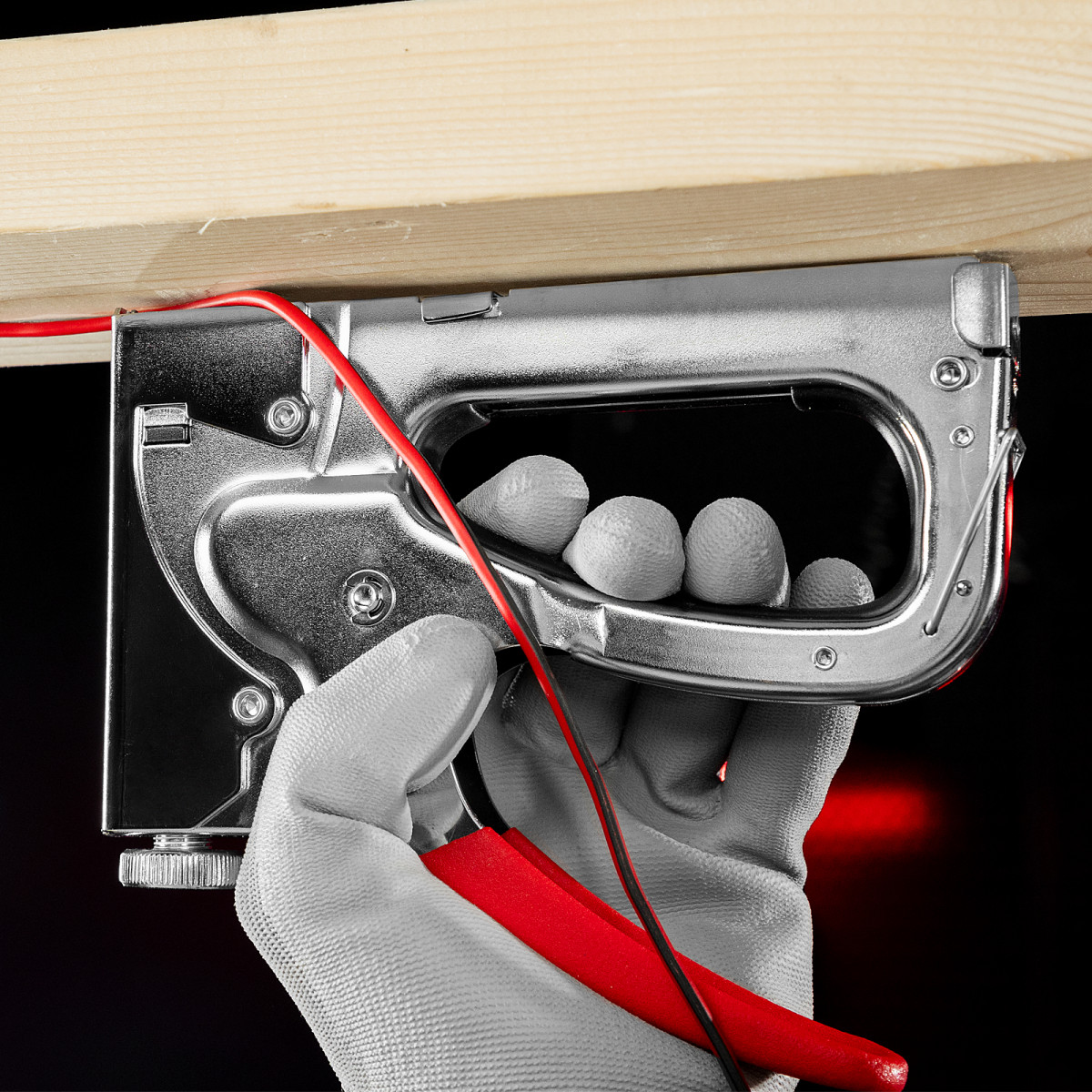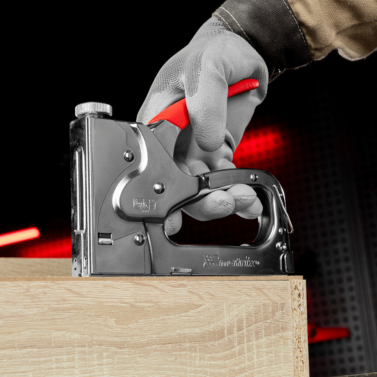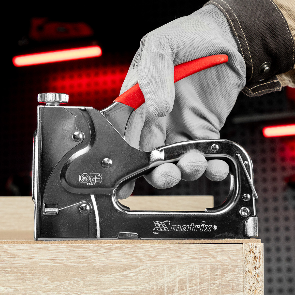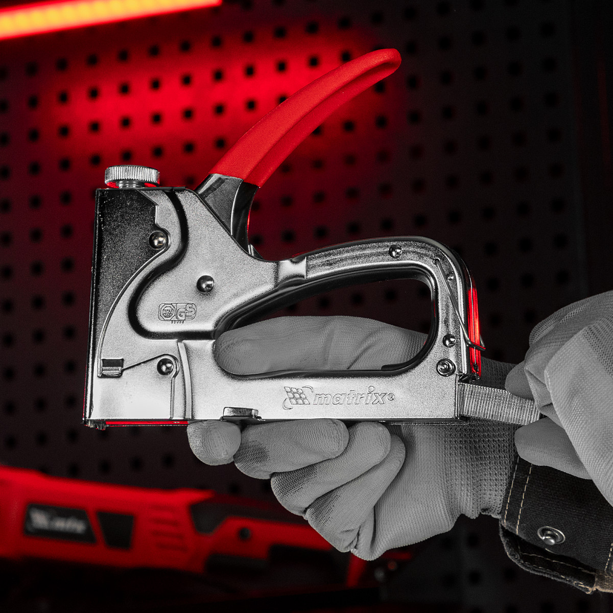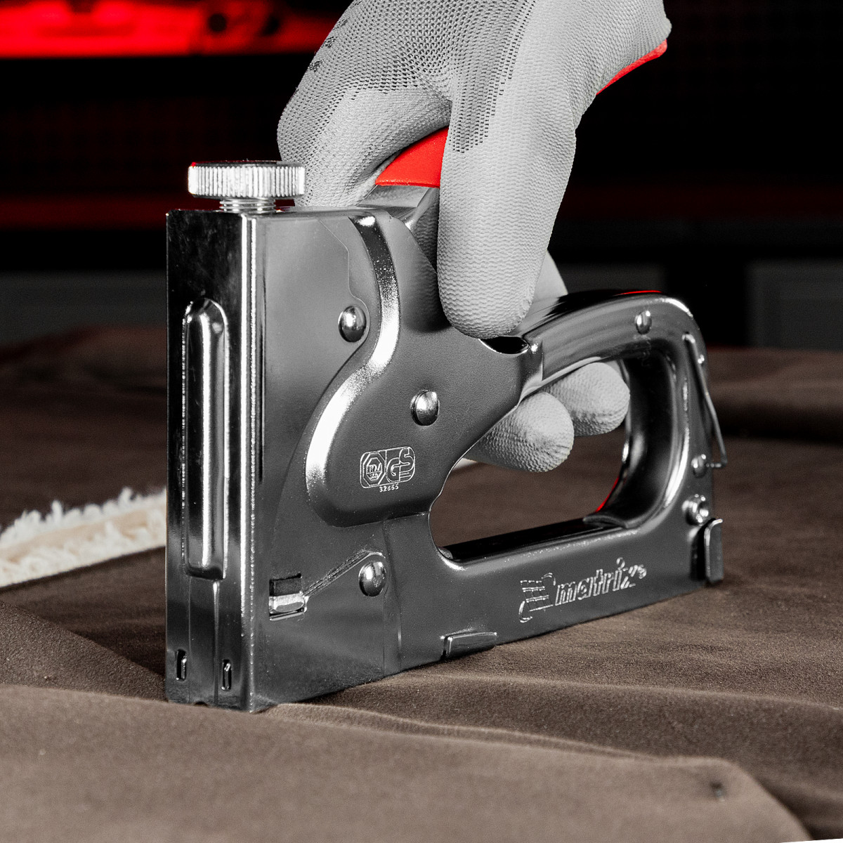 - Безопасное хранение и транспортировка — накидная скоба фиксирует рукоятку, предотвращая случайное срабатывание степлера.