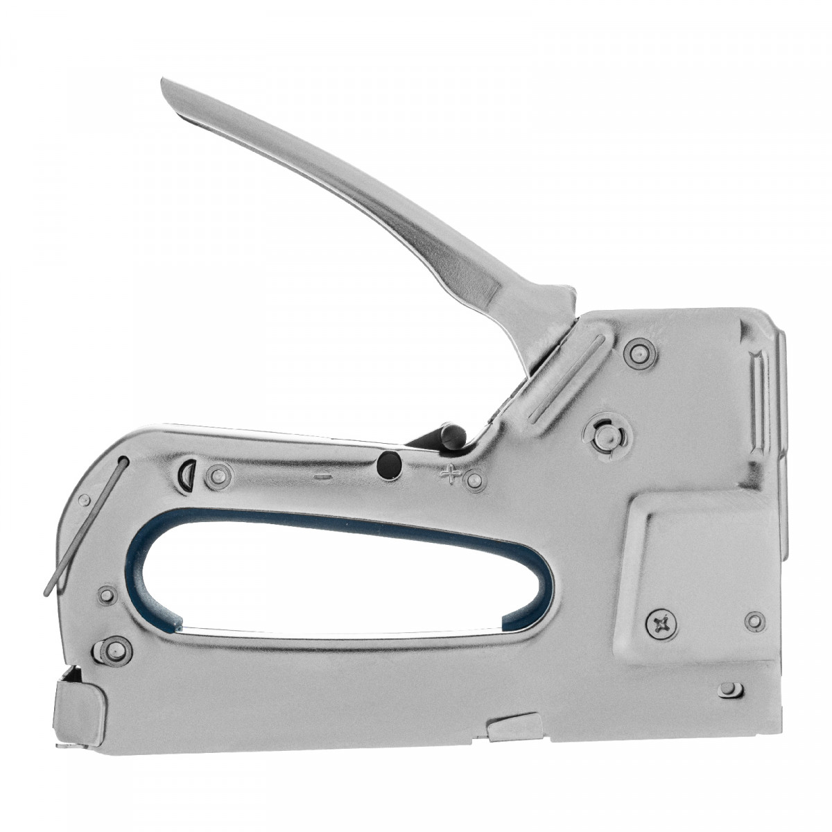 • Безопасное хранение и транспортировка — скоба-фиксатор удерживает рукоятку в нерабочем положении, исключая случайное срабатывание степлера.