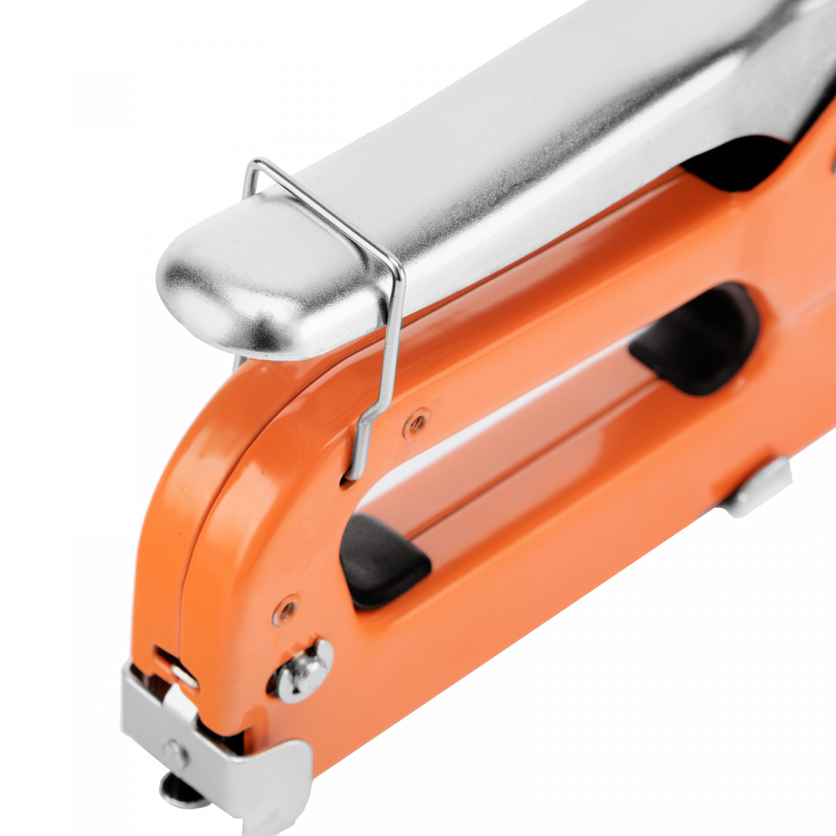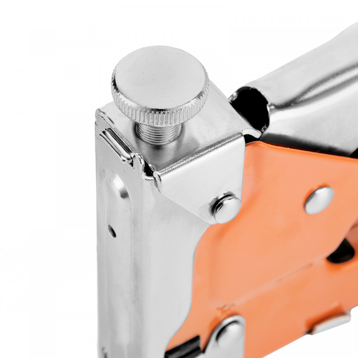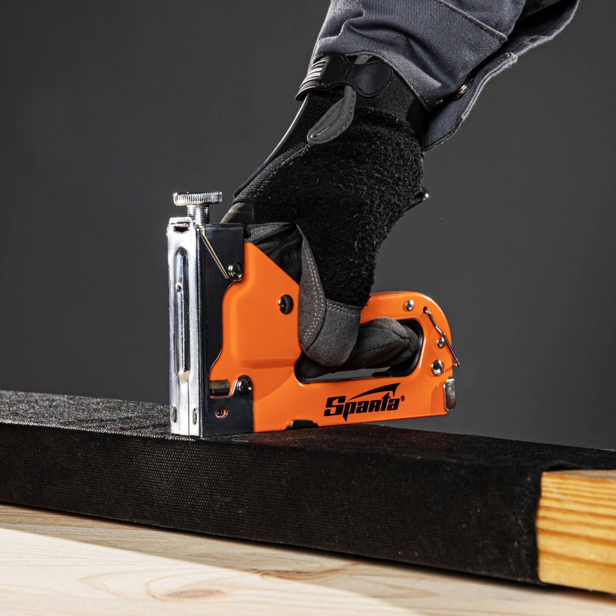 Регулируемый мебельный степлер Sparta 42002 с скобами 200 шт. совместим с крепежом типа 53 размером 4-14 мм, поставляется со скобами в количестве 200 шт. и используется для быстрого крепления на деревянном основании фанеры, оргалита, ДВП, ДСП, утеплителя, пленки и других листовых материалов. Будет полезен во время сборки шкафов, обивки мягкой мебели, а также выполнения теплоизоляционных и других крепежных работ.