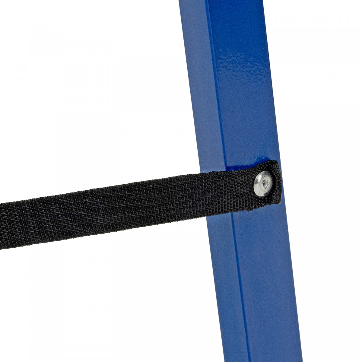 - Надежность — рама изготовлена из профилированной стали, стальная верхняя площадка с зацепами прочно фиксирует стремянку в рабочем положении, страховочные ленты придают дополнительную прочность конструкции.