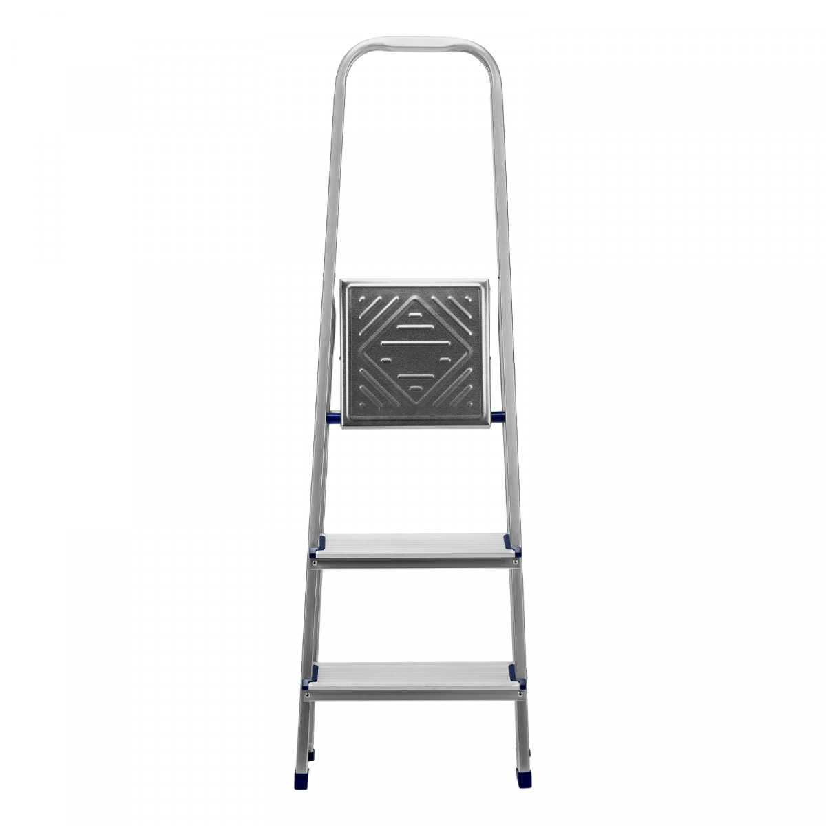 - Надежность — рама из прямоугольного алюминиевого профиля выдерживает нагрузку до 150 кг, широкие ступени закреплены заклепками.
