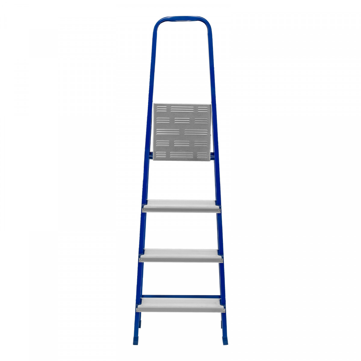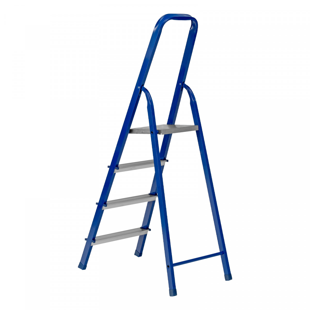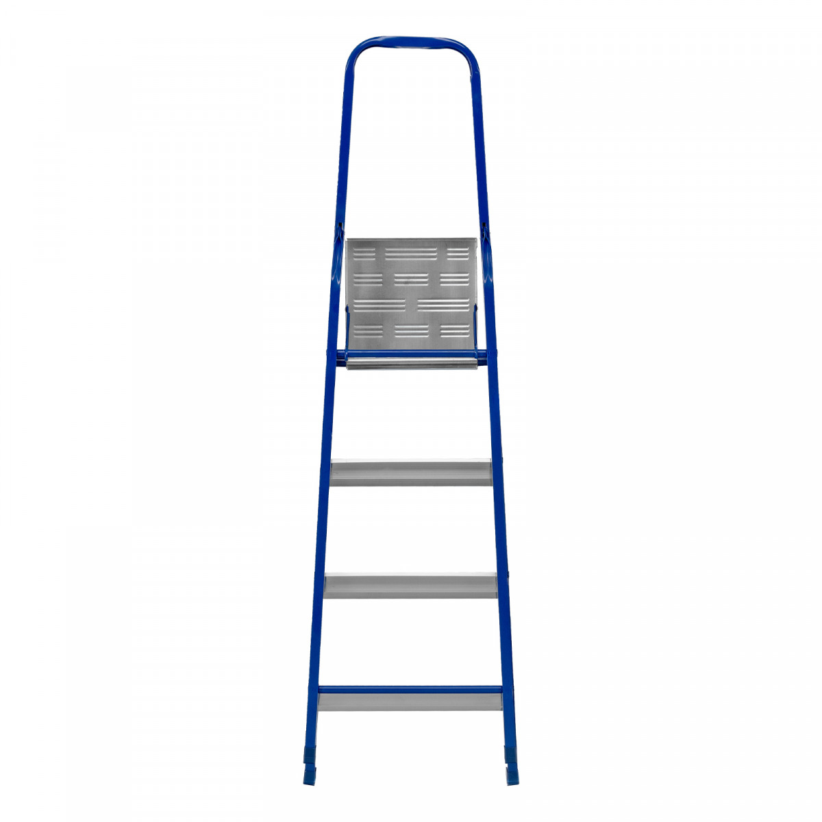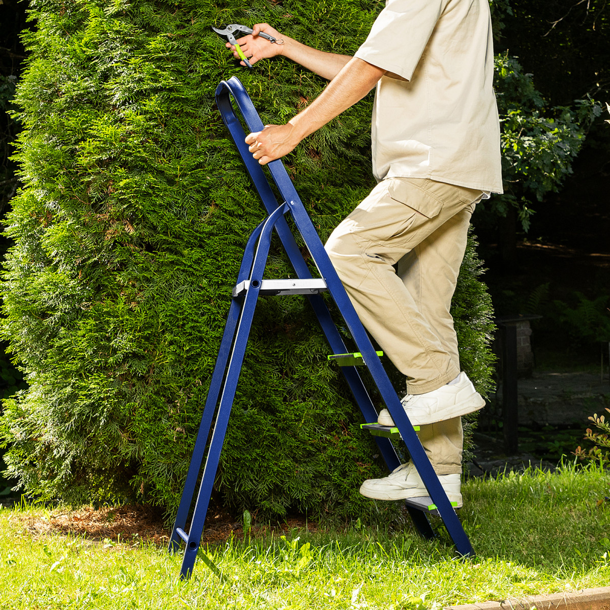 • Надежная конструкция — рама изготовлена из профилированной стали, стальная верхняя площадка с зацепами прочно фиксирует стремянку в рабочем положении.