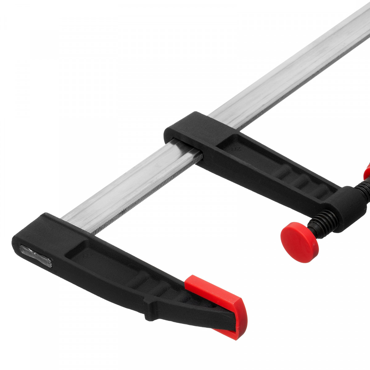 Усиленная F-образная струбцина Matrix 20417 размером 600 х 120 х 700 мм используется для зажима металлических, деревянных и других заготовок для их последующей обработки или сборки. Представляет собой штангу, на которой установлены 2 кронштейна — неподвижный и подвижный. Деталь помещается между ними и прижимается к губкам при помощи винтового зажима с трапециевидной резьбой. Величина захвата регулируется при помощи подвижного кронштейна и может достигать 200 мм. Струбцину используют для проведения слесарных и столярных работ. Металлическая конструкция выдерживает высокую температуру, поэтому инструмент пригодится для выполнения сварочных работ (перед началом необходимо снять пластиковые накладки с губок).