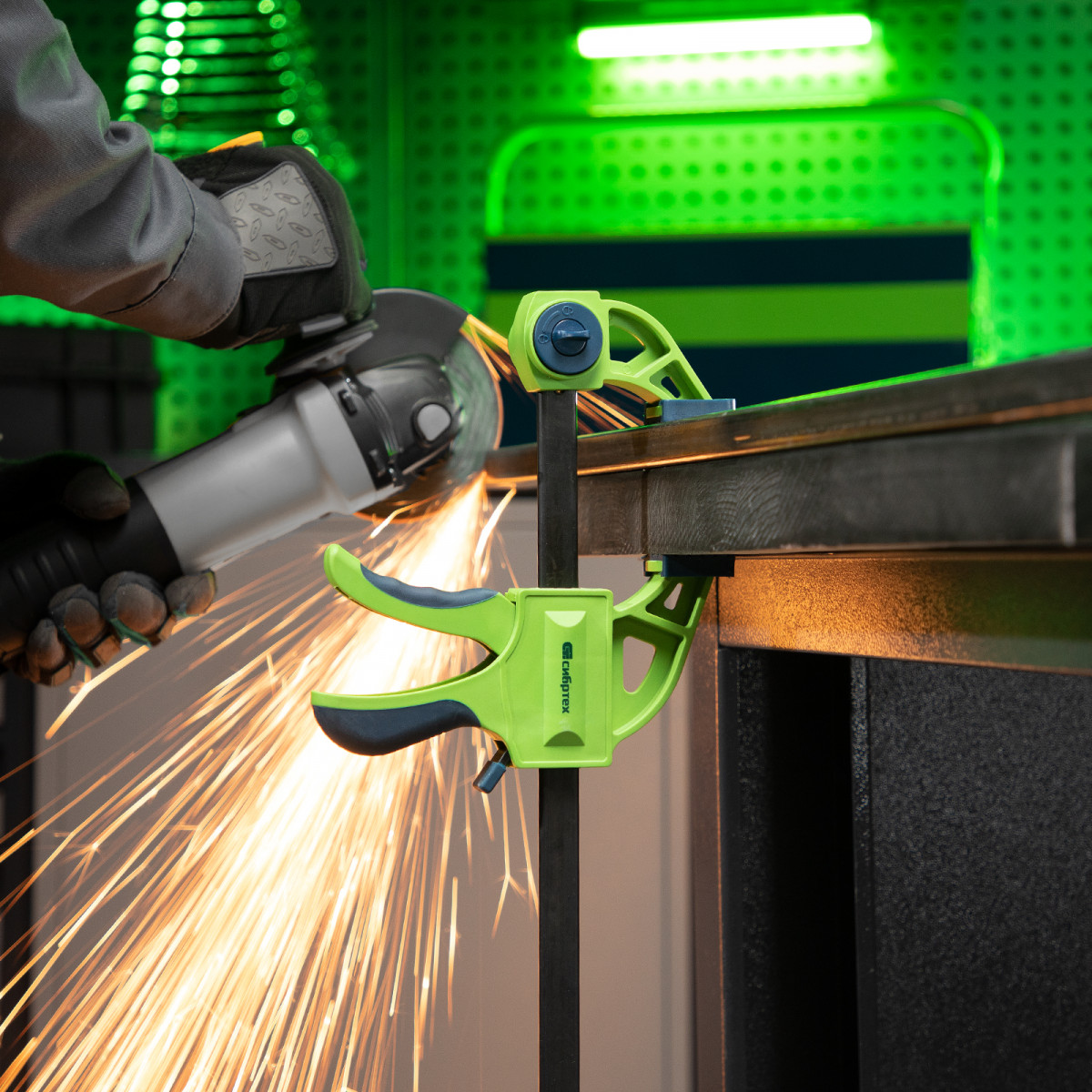 - Дополнительные возможности — опорную губку можно переставить на другой конец штанги, превратив струбцину в распорный инструмент.