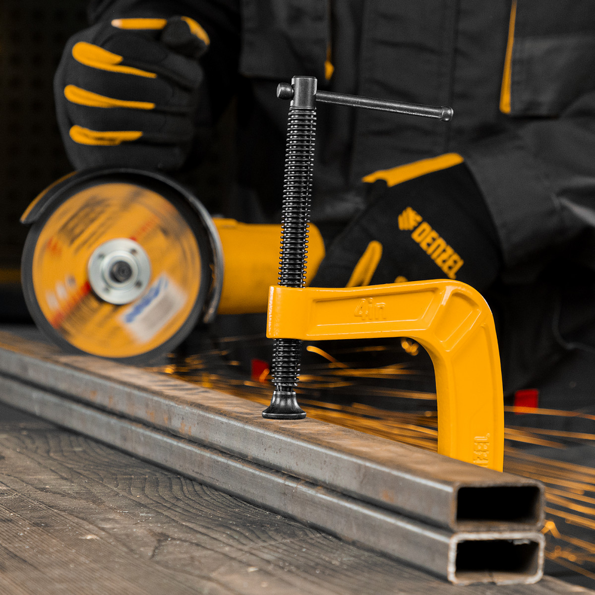 G-образная струбцина Denzel 20643 с максимальной шириной зажима 100 мм используется для фиксации заготовок или закрепления их на верстаке, станке или между собой. Позволяет склеивать детали, а также сверлить их, шлифовать, опиливать и проводить другие работы. Может использоваться во время выполнения сварочных работ. Винт с трапециевидной резьбой обеспечивает надежную фиксацию предметов. Струбцина применяется в слесарном и столярном деле, будет полезна также домашнем хозяйстве.