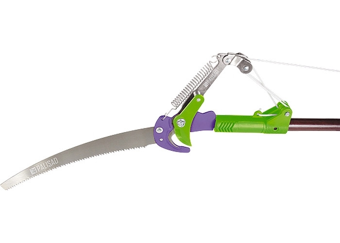 Сучкорез штанговый с прямым резом. В комплект входит стропа длиной 2,34 м, служащая для приведения в действие режущего лезвия. Стропа обкатывается вокруг двух шкивов, что увеличивает усилие реза. Рабочий ход стропы 0,8 м. Предназначен для выполнения работ по уходу за садом. Рекомендуется для дистанционной обрезки живых веток диаметром до 20 мм, расположенных на большой высоте. Для обрезки твердых и сухих веток используется имеющаяся в комплекте пила с крупным зубом 5 TPI, что обеспечивает режущую способность до 60 мм. Может также использоваться для формирования и прореживания кроны деревьев. Режущее лезвие изготовлено из инструментальной стали У8, закалено, остро заточено и имеет оксидированное покрытие для защиты от коррозии. Материал ножовочного полотна – сталь 65Г.