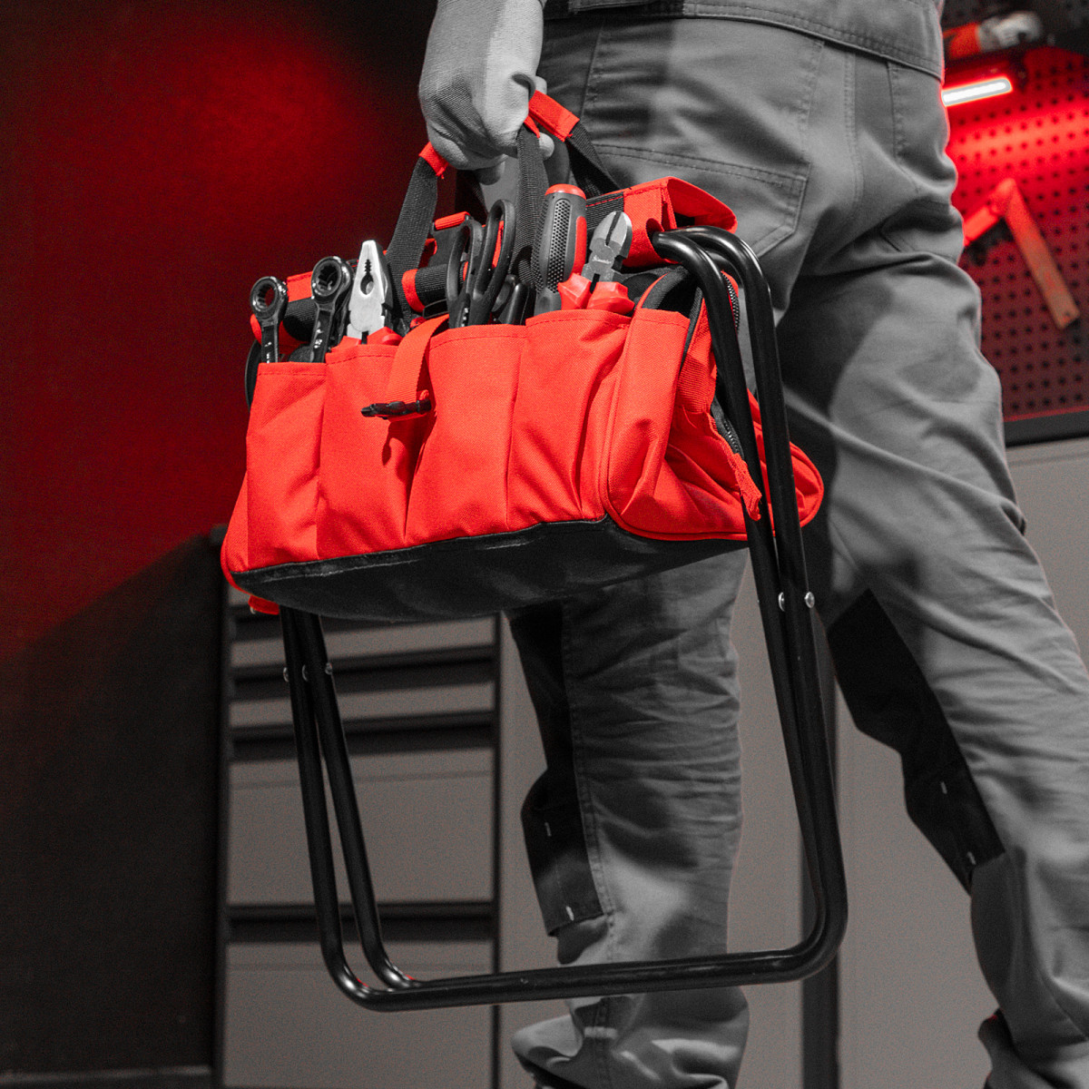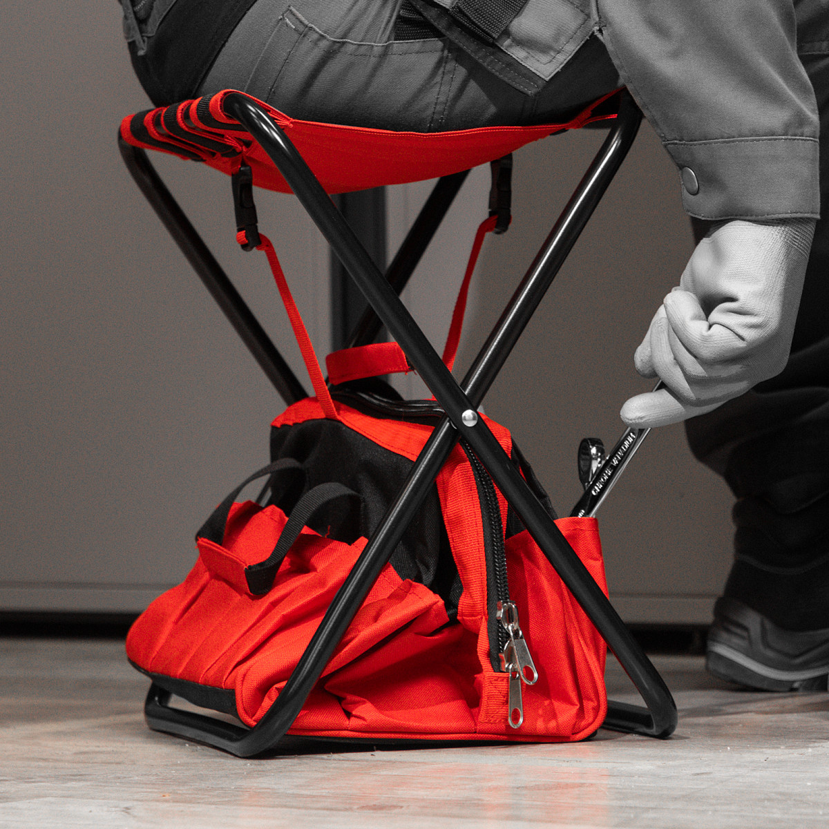 - Многофункциональность — складной стул комплектуется сумкой с вместительным основным отделением и большим количеством карманов, в которых поместятся все необходимые инструменты.