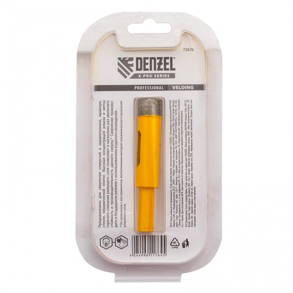 Алмазное сверло Denzel 72676 с трехгранным хвостовиком, для «мокрой» резки, — режущий инструмент для получения точных отверстий диаметром 14 мм. Подходит для работ по стеклу, керамике, а также керамограниту и мрамору. Используется в качестве оснастки для дрелей и шуруповертов. Сверление с применением водяного охлаждения позволит избежать перегрева сверла и продлить срок его службы. Использование кондуктора 72830 препятствует смещению коронки и облегчает засверливание. Оснастка предназначена для профессионального использования.