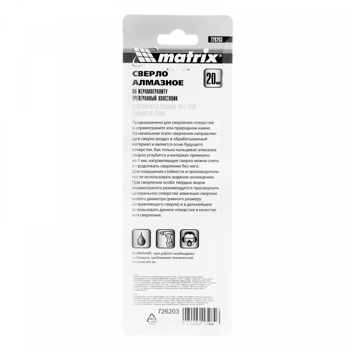 Сверло алмазное по керамограниту, 20 х 67 мм, трехгранный хвостовик Matrix