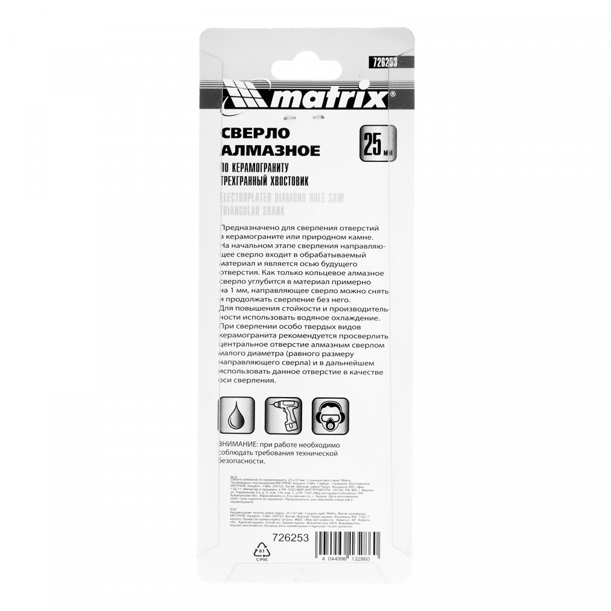 Сверло алмазное по керамограниту, 25 х 67 мм, трехгранный хвостовик Matrix