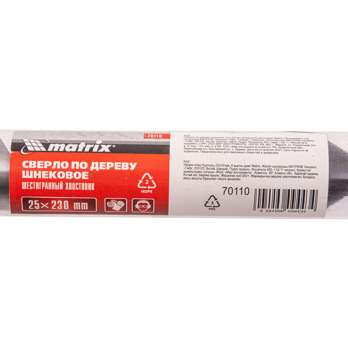 Сверло по дереву шнековое, 25 х 230 мм, шестигранный хвостовик Matrix