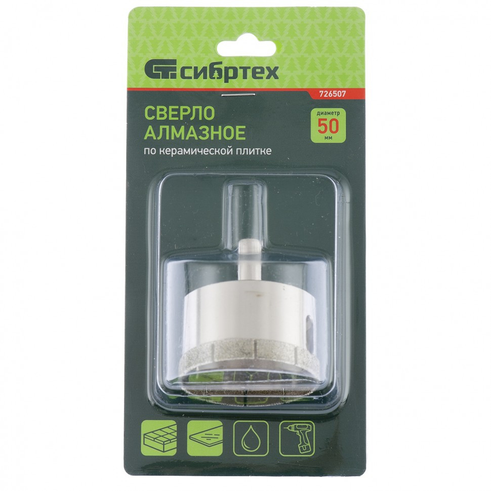 Сверло Сибртех 726507 размером 50 х 55 мм, с цилиндрическим хвостовиком, используется для получения ровных отверстий без сколов в стекле и керамической плитке. Устанавливается в патрон дрели или шуруповерта, работающих в диапазоне 350-700 об/мин. Во время работы рекомендуется применять водяное охлаждение — это существенно увеличит ресурс оснастки. Использование кондуктора (арт. 72830) позволяет точно позиционировать сверло и облегчает засверливание. Оснастка подходит для выполнения работ небольшого объема и рекомендована для использования в быту.