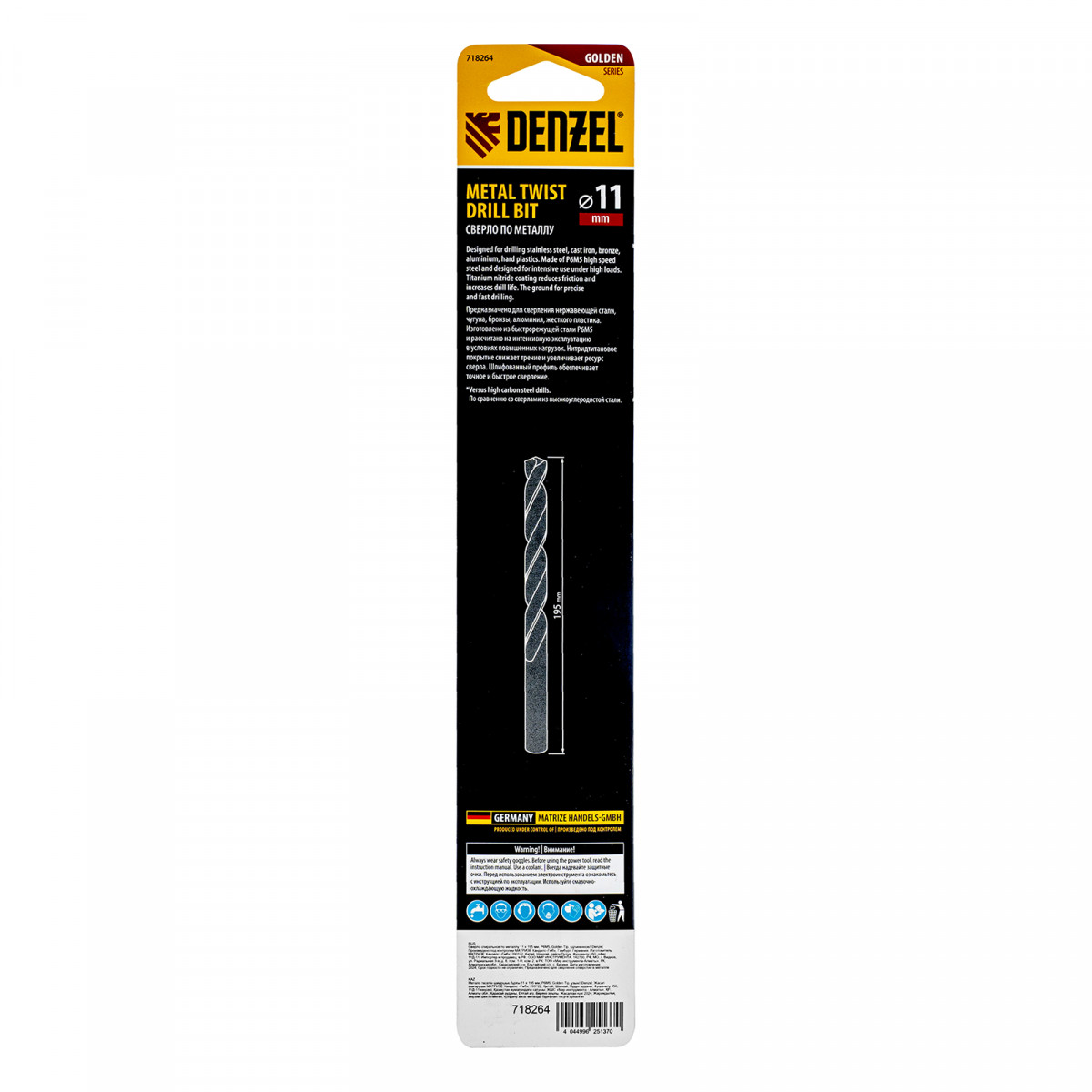 Сверло спиральное по металлу 11 х 195 мм, Р6М5, Golden Tip, удлиненное Denzel