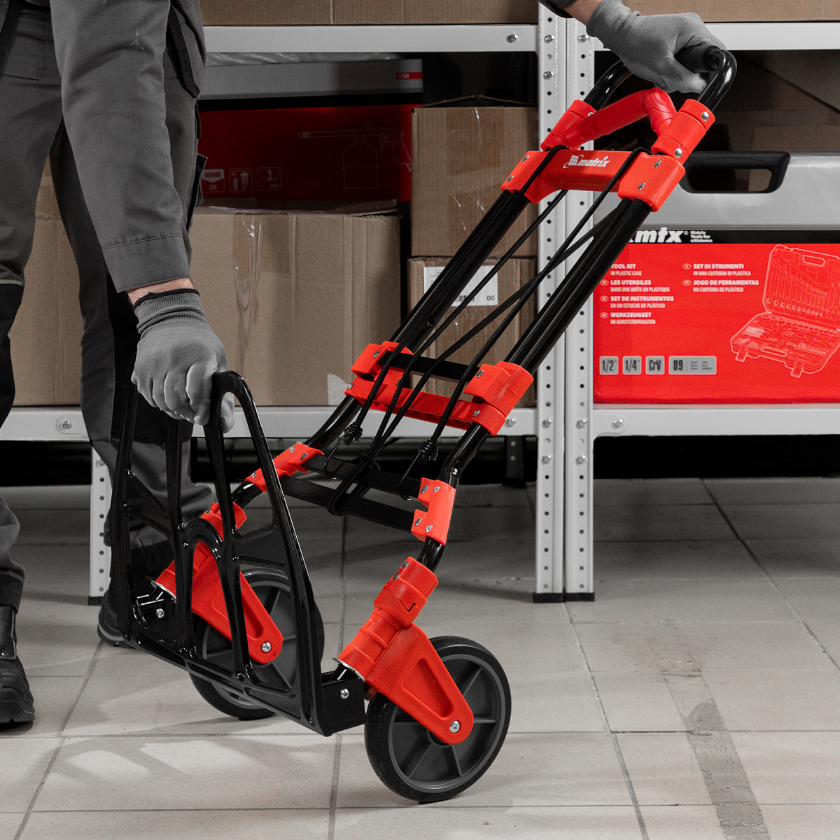 • Удобное хранение и транспортировка — платформа и колеса складываются, поэтому тележка не занимает много места.