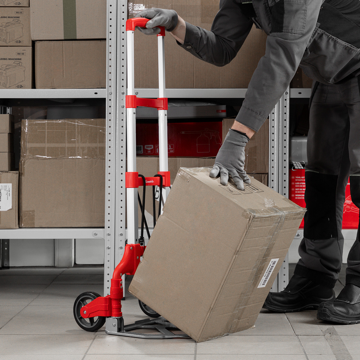 - Удобное хранение и транспортировка — платформа и колеса складываются, поэтому тележка не занимает много места.