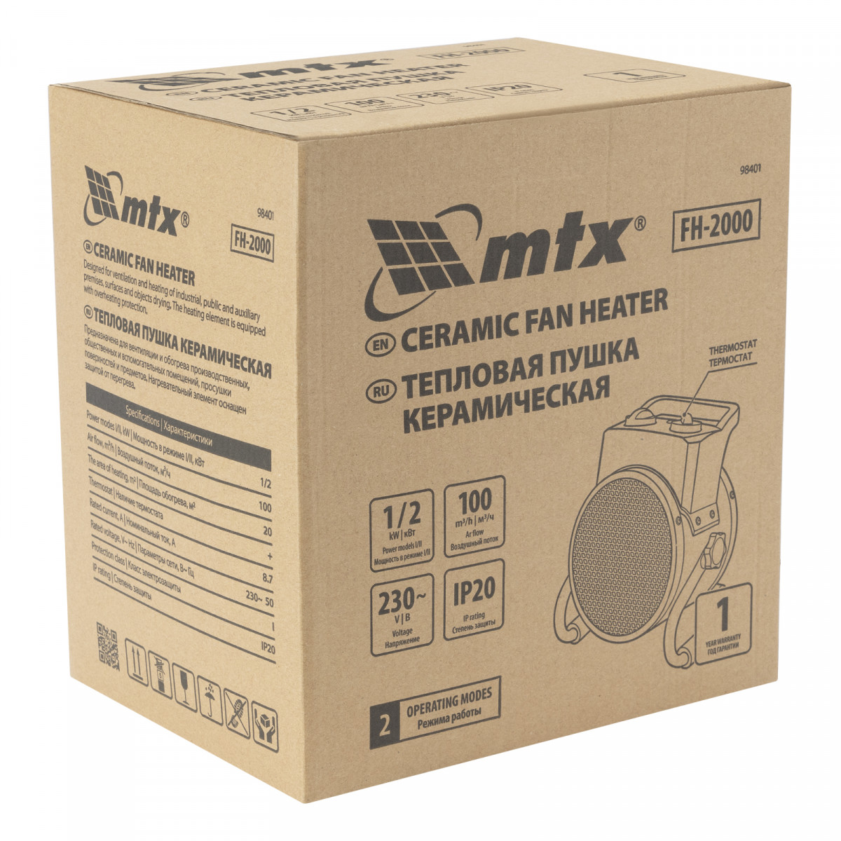 Керамическая тепловая пушка MTX FH-2000 98401 с термостатом, максимальной мощностью 2 кВт, работает в 2 режимах и предназначена для обогрева складов, мастерских и других нежилых помещений площадью до 20 м2. Также может использоваться для быстрой просушки различных поверхностей, например, стяжки пола, оштукатуренных и окрашенных стен.