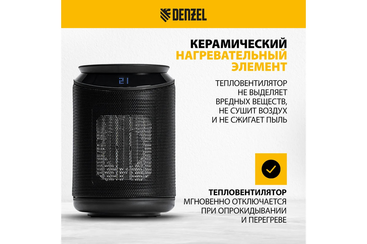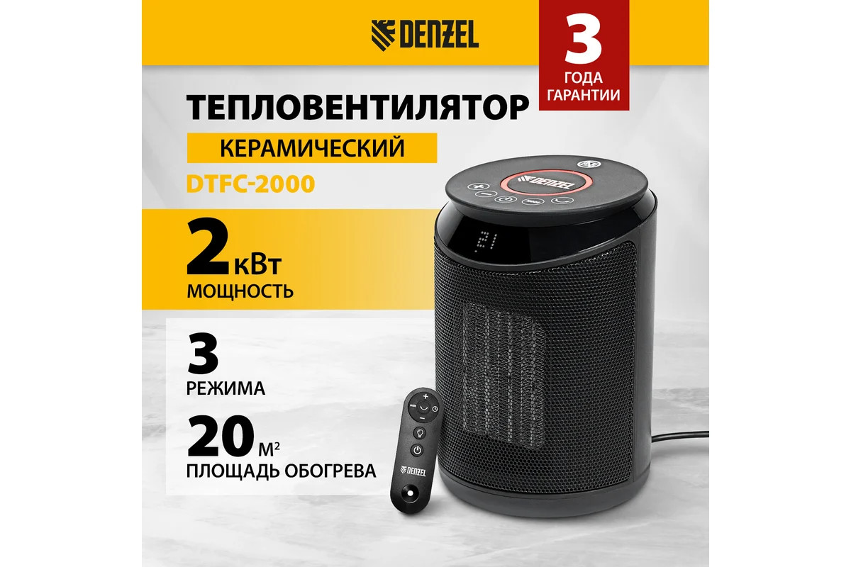 Электрический тепловентилятор Denzel DTFC-2000, керамический, пульт, 3 режима, вентилятор, нагрев 1000/2000 Вт 96419 с керамическим нагревательным элементом предназначен для обогрева и вентилирования бытовых помещений площадью до 20 м.кв.