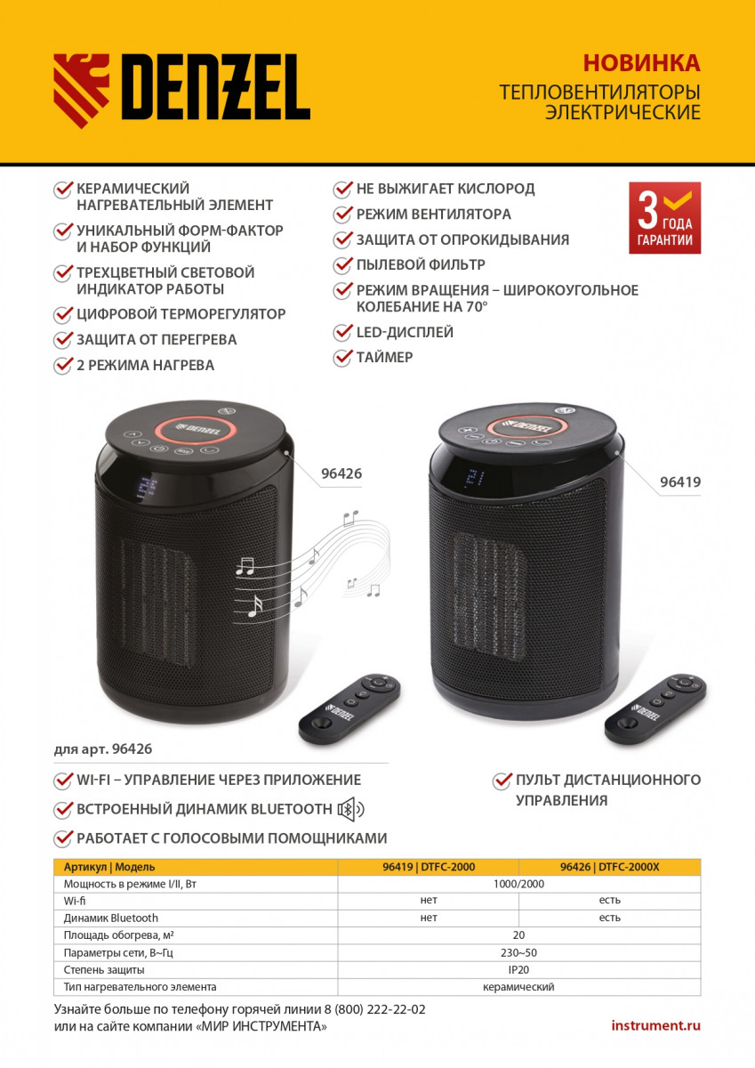 Тепловентилятор керамический DTFC-2000X, 2 кВт, wi-fi, пульт, динамик, вращение, 3 реж. Denzel