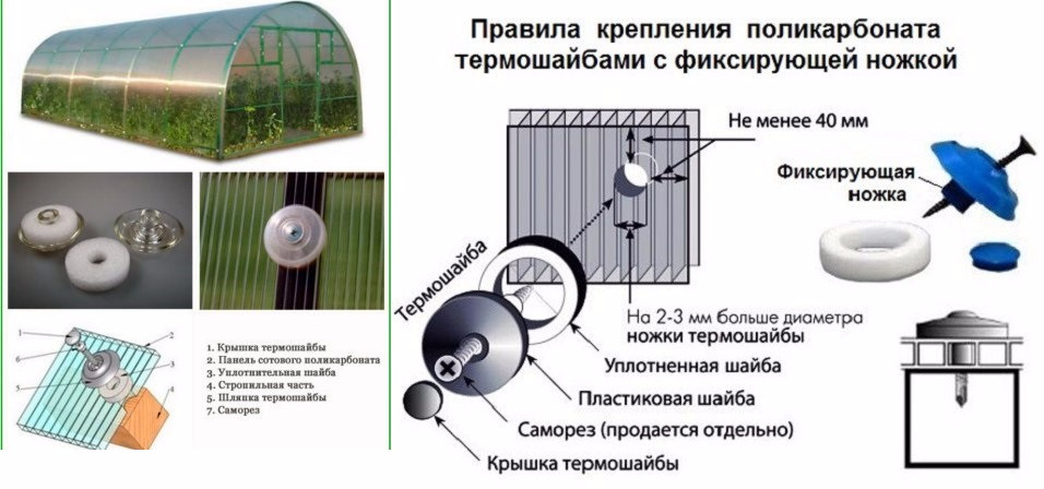 Термошайба — имеет монолитную форму с ножкой которая различается по высоте, в зависимости от используемого поликарбоната. Обеспечивает герметичное и надежное крепление поликарбонатных листов, устраняет «мостики холода», создающиеся саморезами, предотвращает смятие панели, и позволяющие осуществить крепление сотового поликарбоната к каркасу конструкции непосредственно сквозь панель. Достоинства: - Термошайбы эстетичны и очень просты в использовании. - Ликвидируют "мостики" холода, образующиеся при использовании саморезов с обычными шайбами. - Позволяют листам расширяться в условиях летней жары. - Обеспечивают надежное крепление листов при воздействии сильных ветров и даже в условиях ураганов и штормов. - Уплотнительная шайба делает крепление неуязвимым для воздействий внешней среды. - Специальная защелкивающаяся крышечка закрывает саморез. Прочность и долговечность. - Термошайбы производятся из УФ-стабилизированного поликарбоната, что гарантирует их прочность и устойчивость к воздействию окружающей среды.