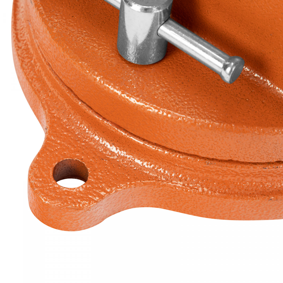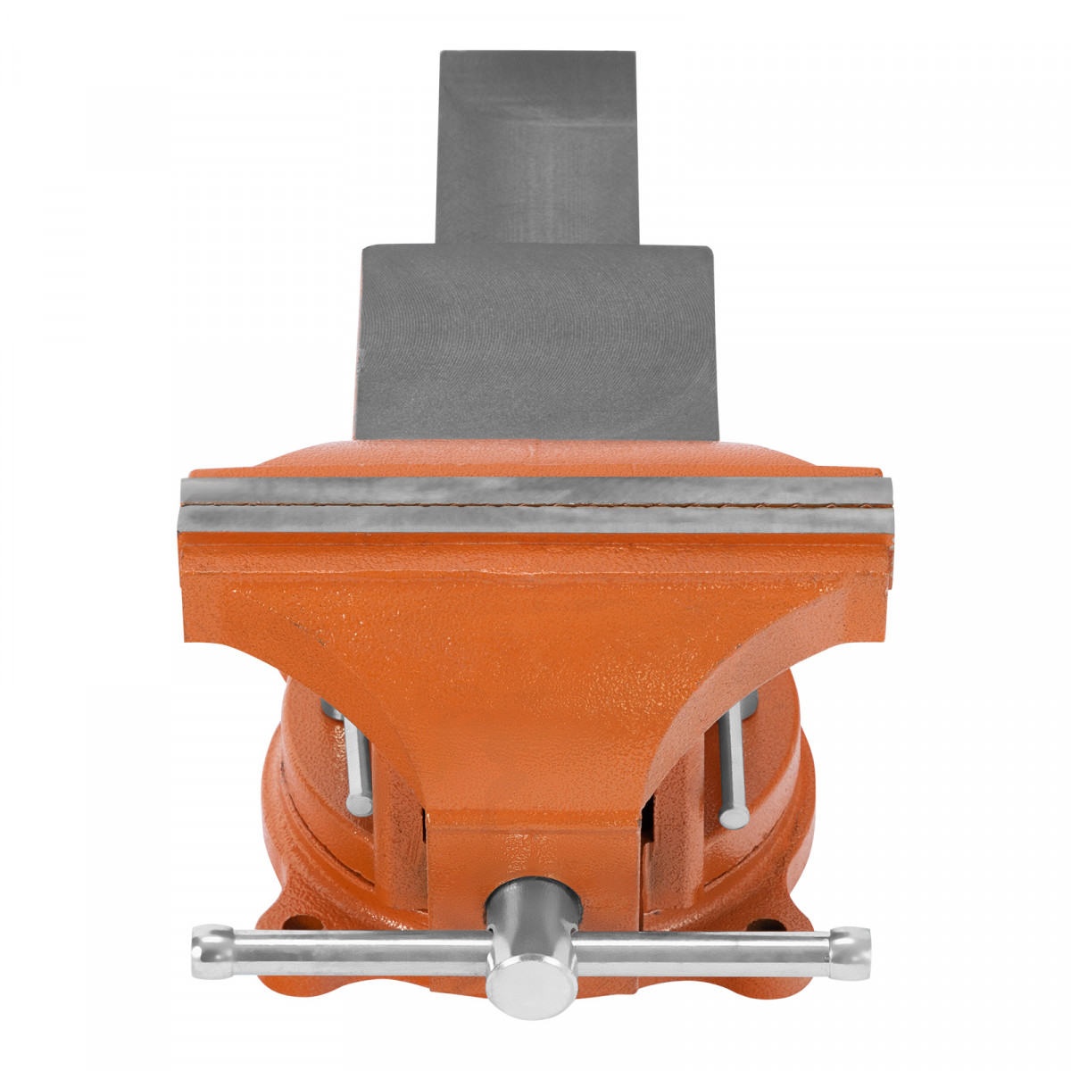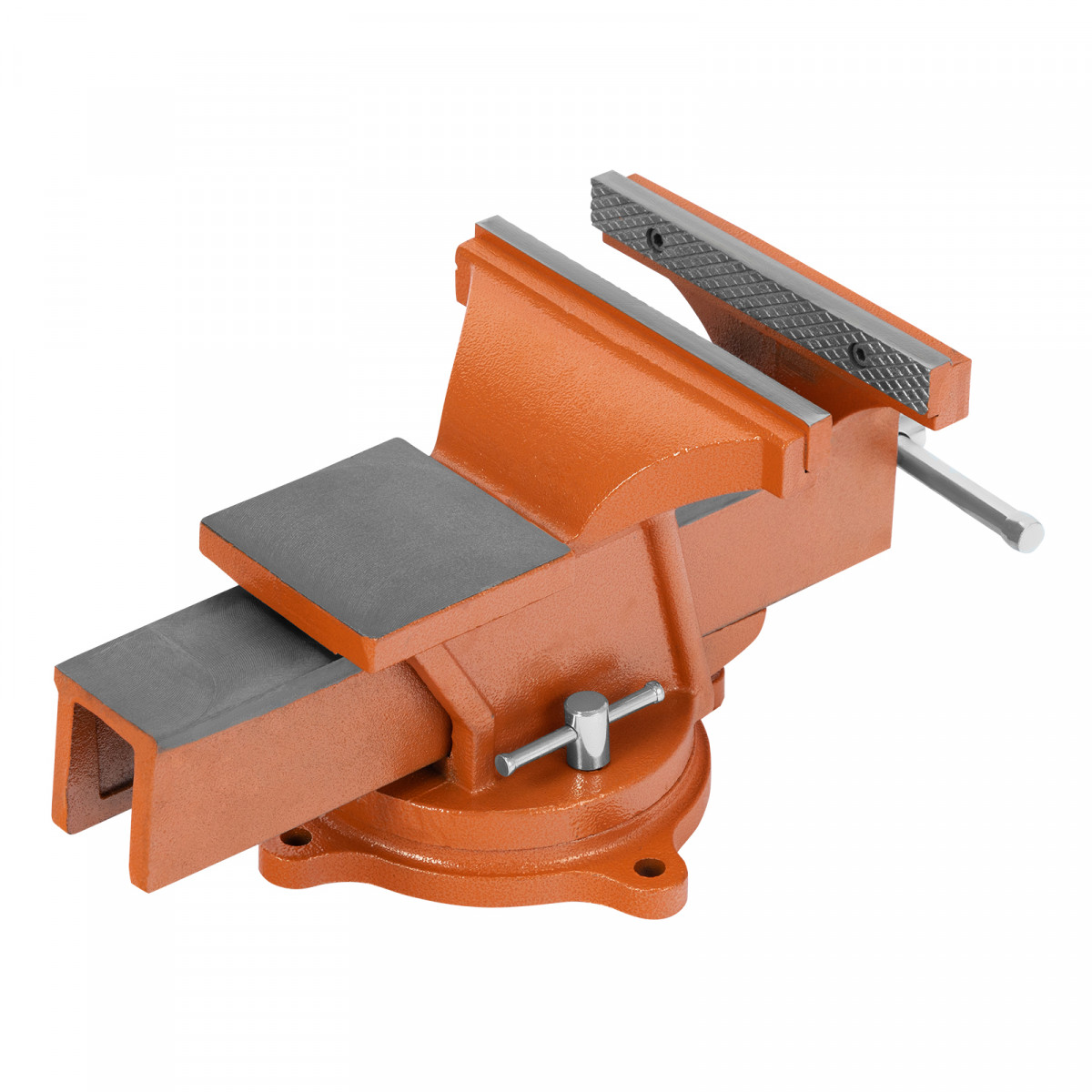 Поворотные тиски Sparta с наковальней обеспечивают высокую прочность благодаря корпусу из чугуна и губкам из стали.