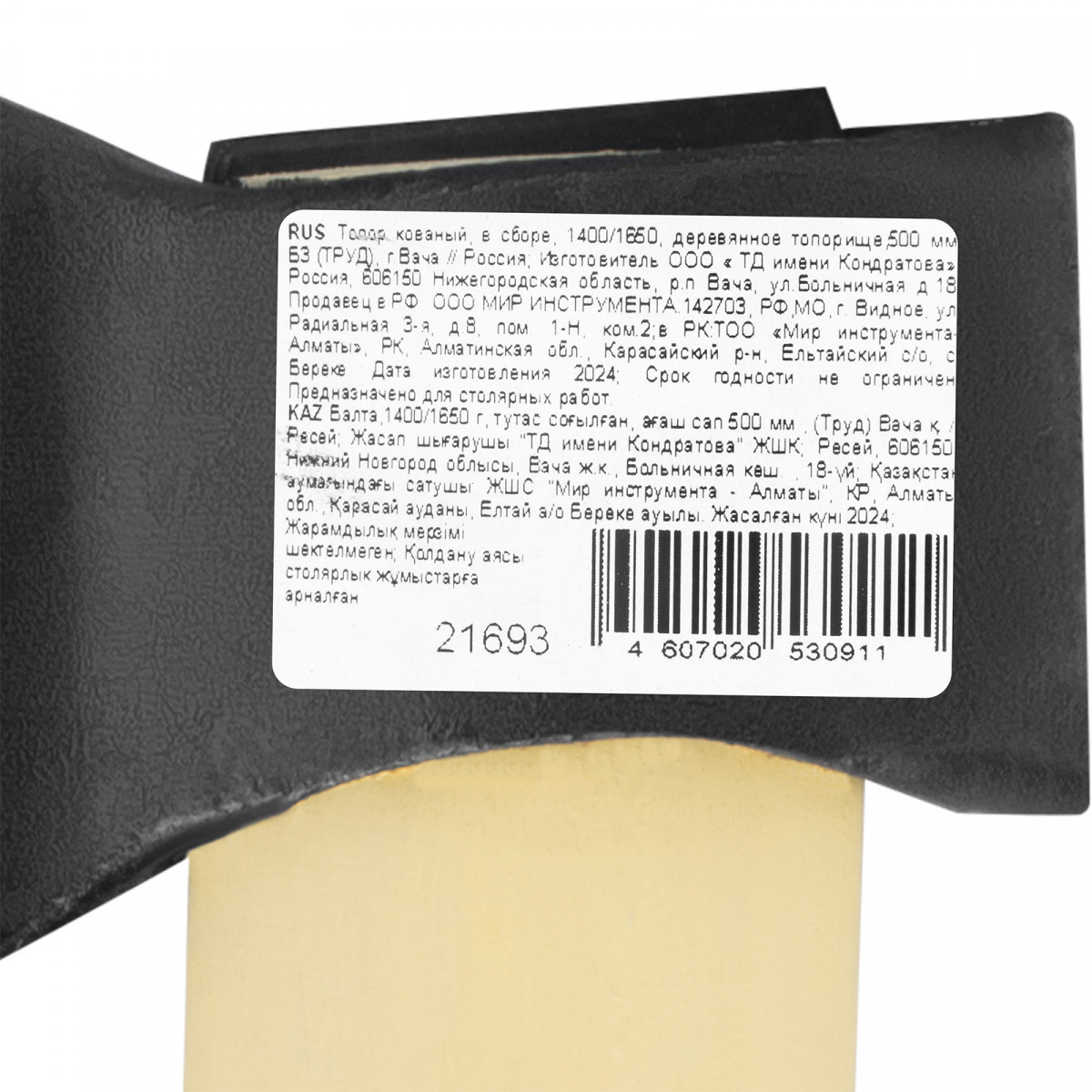Кованый топор Б3 Труд 21693 с рабочей частью весом 1400 г (общий вес 1650 г), в сборе с деревянным топорищем длиной 500 мм, предназначен для рубки и тесания древесины. Будет полезен для грубой обработки заготовок на строительной площадке и в загородном доме.